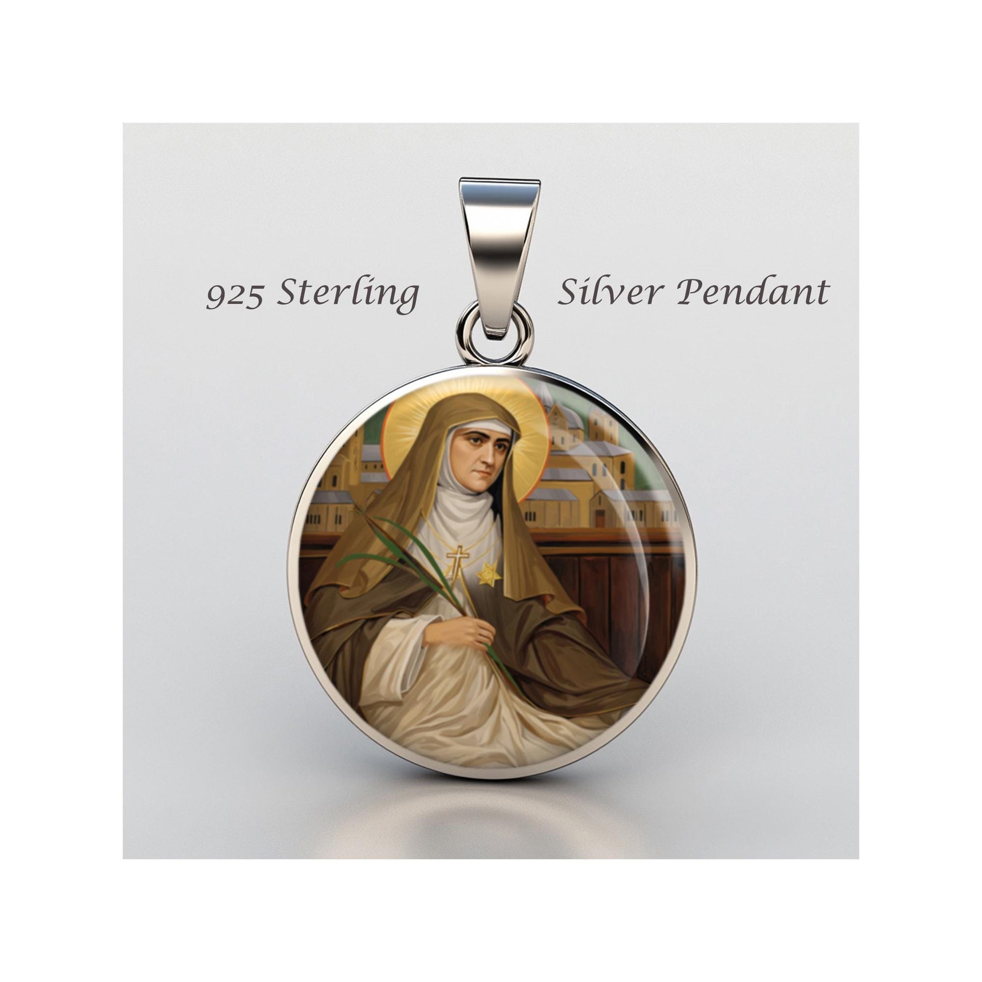 Dedicated to Saint Edith Stein, this 20mm sterling silver pendant features a delicate design under a clear glass dome, crafted with high-quality paper. The pendant comes in a beautiful jewelry box, ready for gifting—perfect for birthdays, anniversaries, Christmas, Easter, Baptism, First Communion, Confirmation, Mother's Day, or as a thoughtful gift for a loved one.
