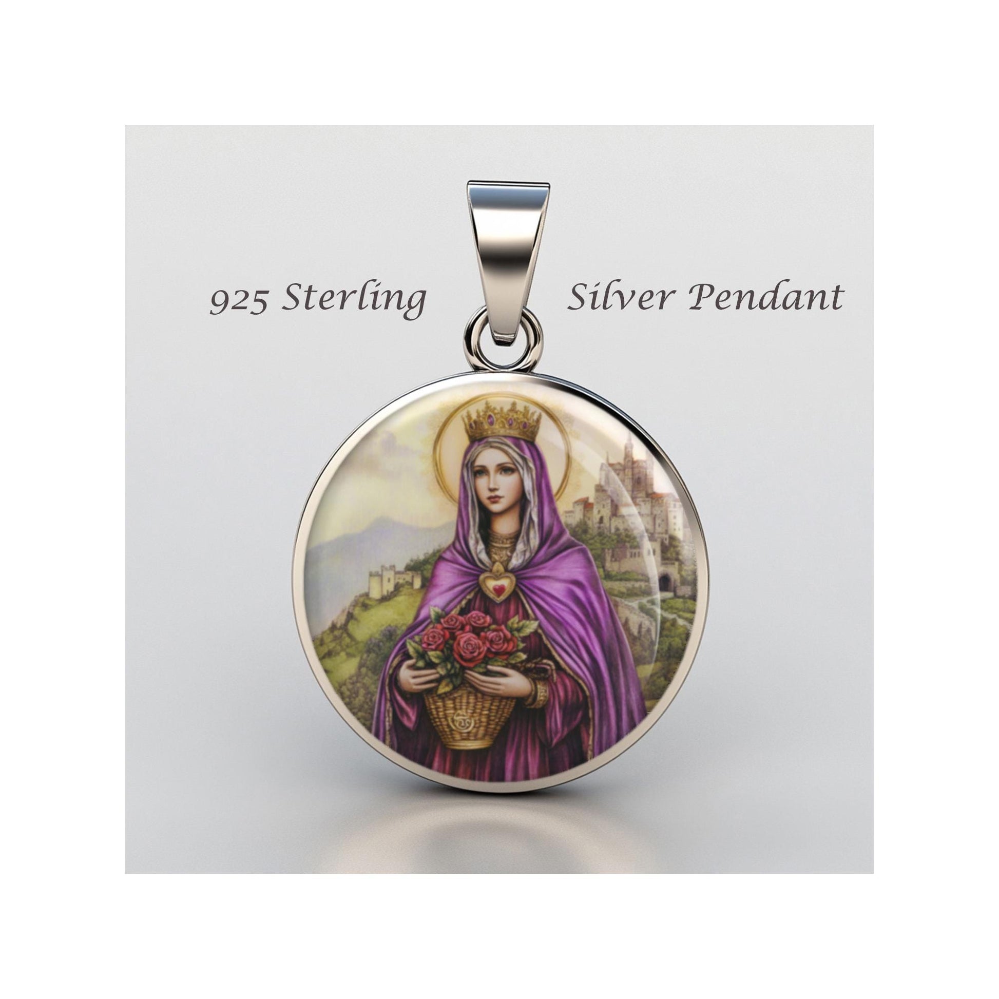 Dedicated to Saint Elizabeth Of Hungary, this 20mm sterling silver pendant features a delicate design under a clear glass dome, crafted with high-quality paper. The pendant comes in a beautiful jewelry box, ready for gifting—perfect for birthdays, anniversaries, Christmas, Easter, Baptism, First Communion, Confirmation, Mother's Day, or as a thoughtful gift for a loved one.