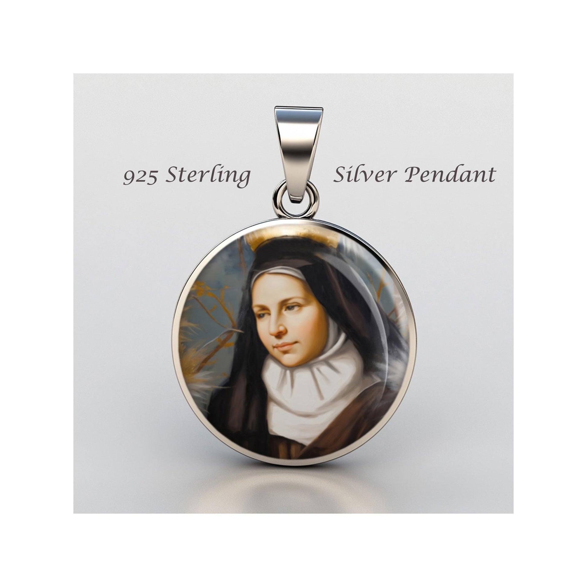 Dedicated to Saint Elizabeth Of The Trinity, this 20mm sterling silver pendant features a delicate design under a clear glass dome, crafted with high-quality paper. The pendant comes in a beautiful jewelry box, ready for gifting—perfect for birthdays, anniversaries, Christmas, Easter, Baptism, First Communion, Confirmation, Mother's Day, or as a thoughtful gift for a loved one.