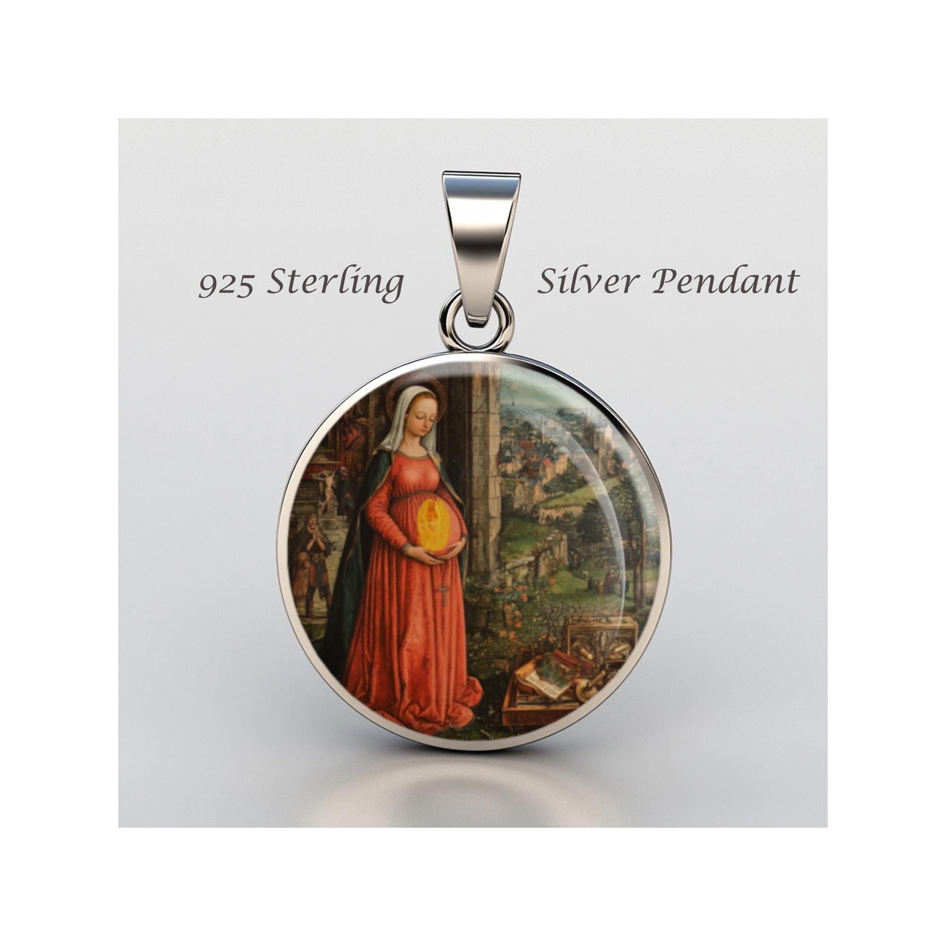 Dedicated to Saint Elizabeth Pregnant, this 20mm sterling silver pendant features a delicate design under a clear glass dome, crafted with high-quality paper. The pendant comes in a beautiful jewelry box, ready for gifting—perfect for birthdays, anniversaries, Christmas, Easter, Baptism, First Communion, Confirmation, Mother's Day, or as a thoughtful gift for a loved one.