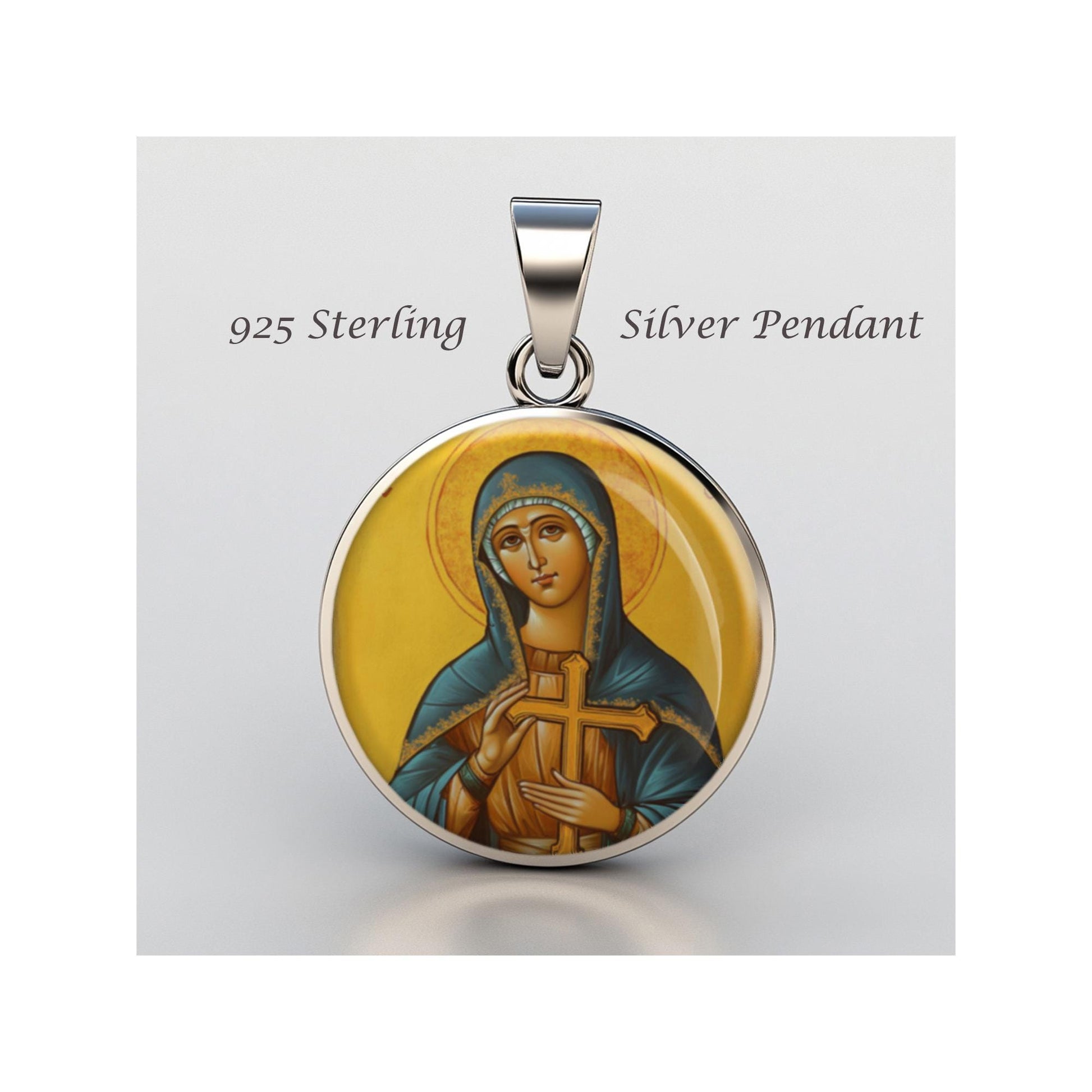 Dedicated to Saint Faith, this 20mm sterling silver pendant features a delicate design under a clear glass dome, crafted with high-quality paper. The pendant comes in a beautiful jewelry box, ready for gifting—perfect for birthdays, anniversaries, Christmas, Easter, Baptism, First Communion, Confirmation, Mother's Day, or as a thoughtful gift for a loved one.