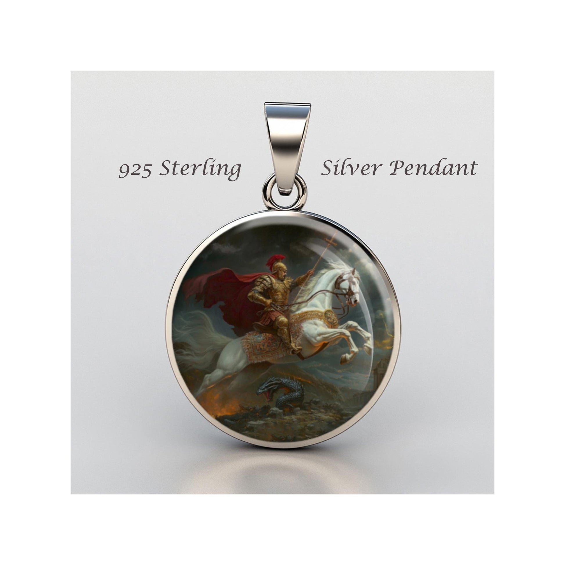 Dedicated to Saint George, this 20mm sterling silver pendant features a delicate design under a clear glass dome, crafted with high-quality paper. The pendant comes in a beautiful jewelry box, ready for gifting—perfect for birthdays, anniversaries, Christmas, Easter, Baptism, First Communion, Confirmation, Mother's Day, or as a thoughtful gift for a loved one.