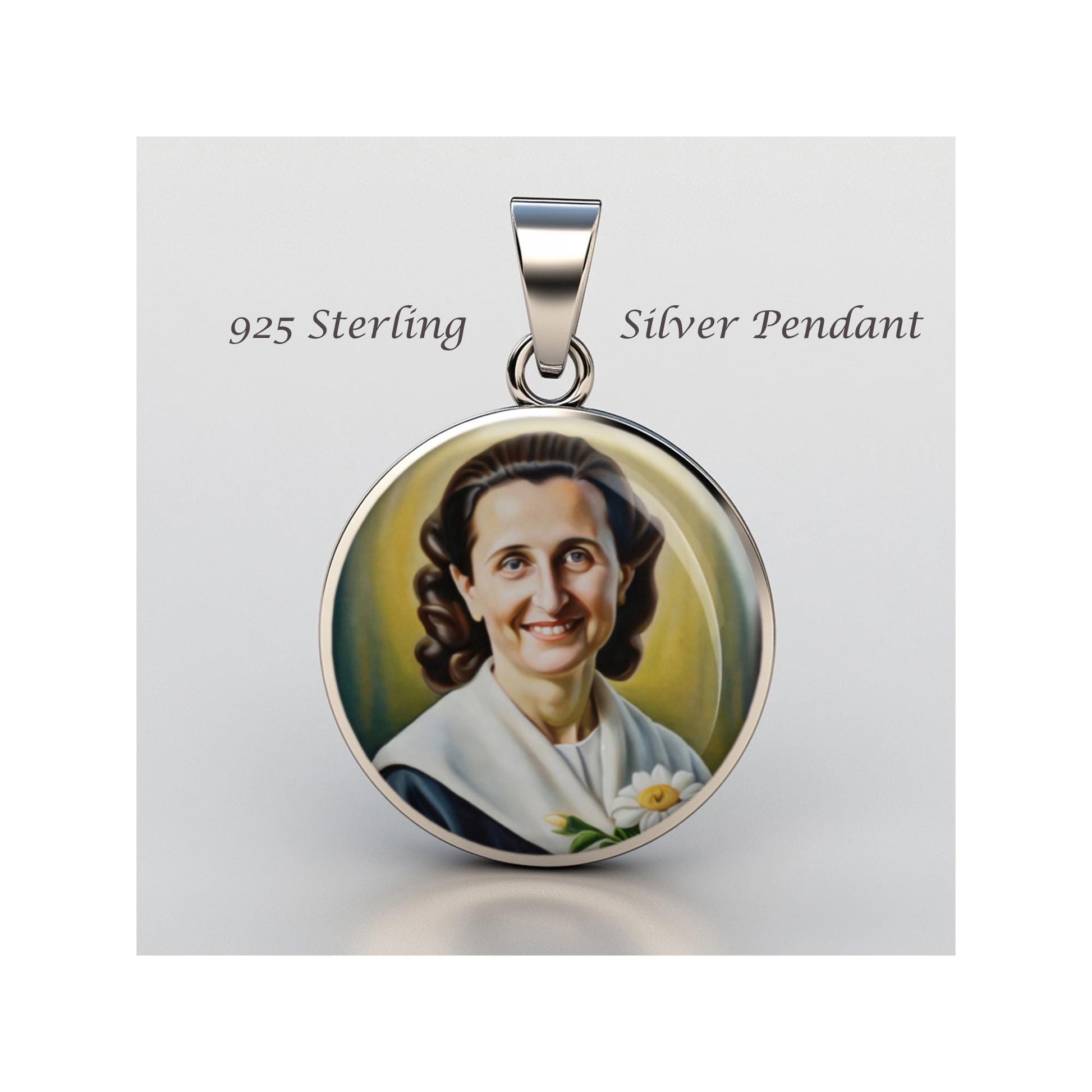 Dedicated to Saint Gianna Beretta Molla, this 20mm sterling silver pendant features a delicate design under a clear glass dome, crafted with high-quality paper. The pendant comes in a beautiful jewelry box, ready for gifting—perfect for birthdays, anniversaries, Christmas, Easter, Baptism, First Communion, Confirmation, Mother's Day, or as a thoughtful gift for a loved one.