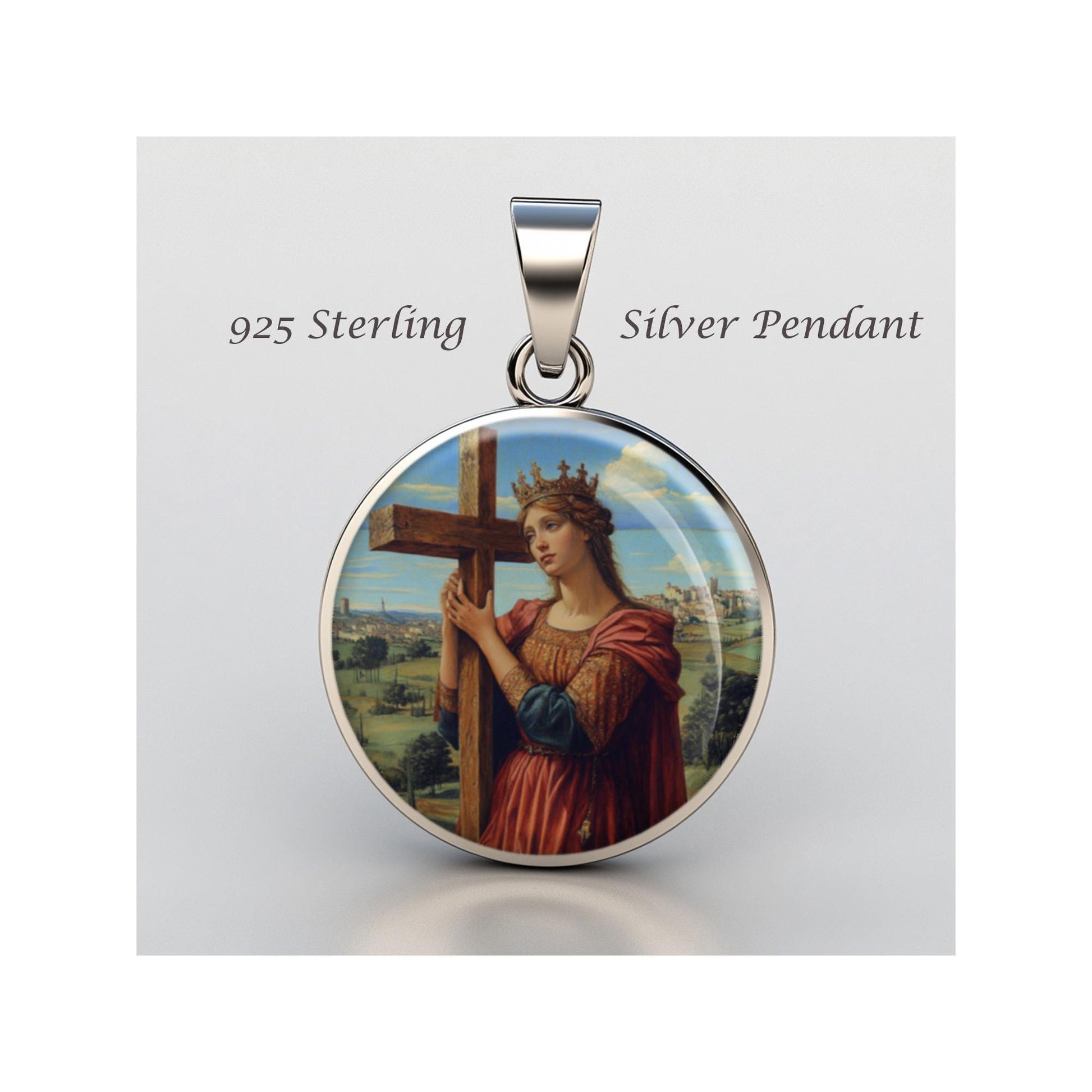 Dedicated to Saint Helena Of Constantinople, this 20mm sterling silver pendant features a delicate design under a clear glass dome, crafted with high-quality paper. The pendant comes in a beautiful jewelry box, ready for gifting—perfect for birthdays, anniversaries, Christmas, Easter, Baptism, First Communion, Confirmation, Mother's Day, or as a thoughtful gift for a loved one.