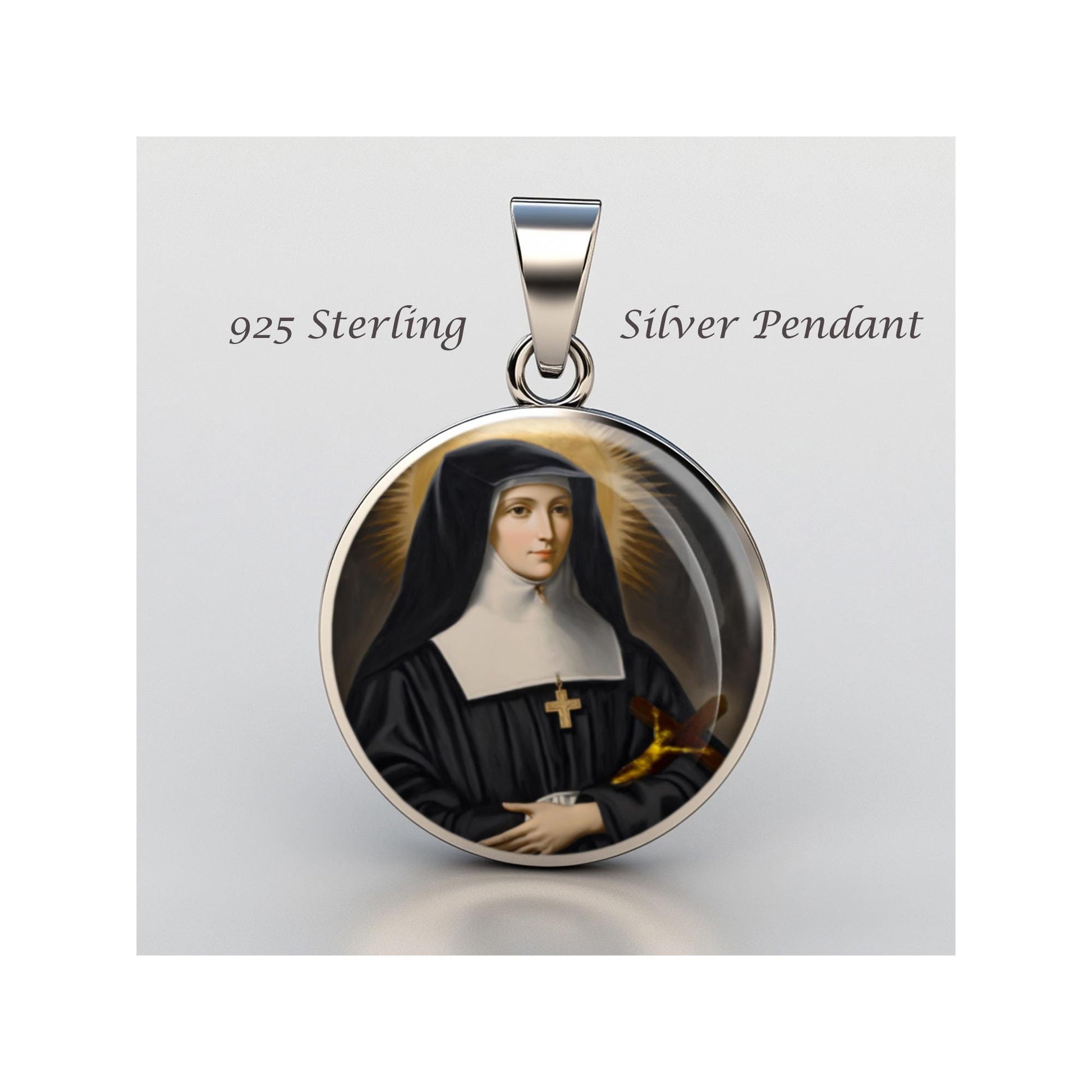 Dedicated to Saint Jane Frances De Chantal, this 20mm sterling silver pendant features a delicate design under a clear glass dome, crafted with high-quality paper. The pendant comes in a beautiful jewelry box, ready for gifting—perfect for birthdays, anniversaries, Christmas, Easter, Baptism, First Communion, Confirmation, Mother's Day, or as a thoughtful gift for a loved one.