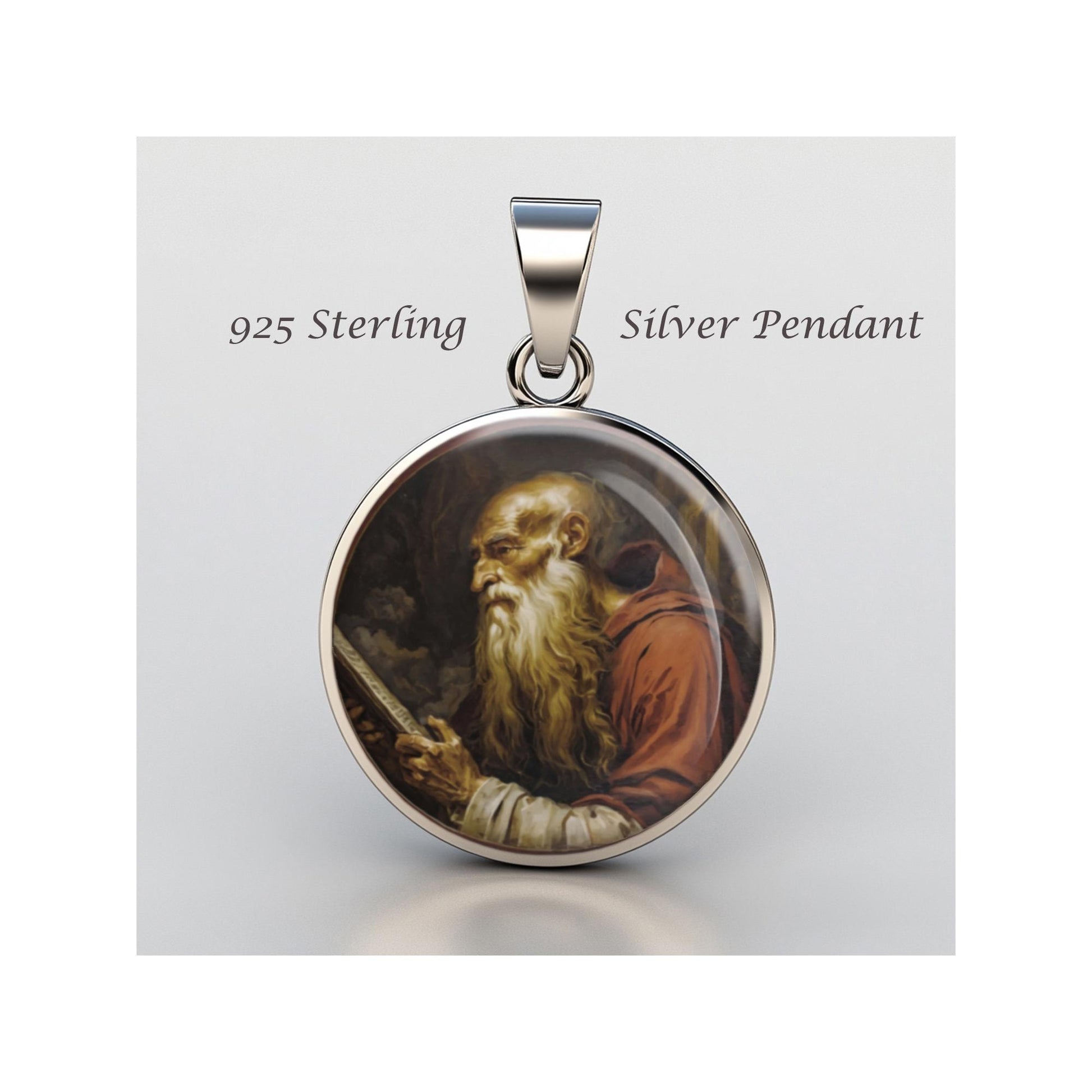 Dedicated to Saint Jerome, this 20mm sterling silver pendant features a delicate design under a clear glass dome, crafted with high-quality paper. The pendant comes in a beautiful jewelry box, ready for gifting—perfect for birthdays, anniversaries, Christmas, Easter, Baptism, First Communion, Confirmation, Mother's Day, or as a thoughtful gift for a loved one.