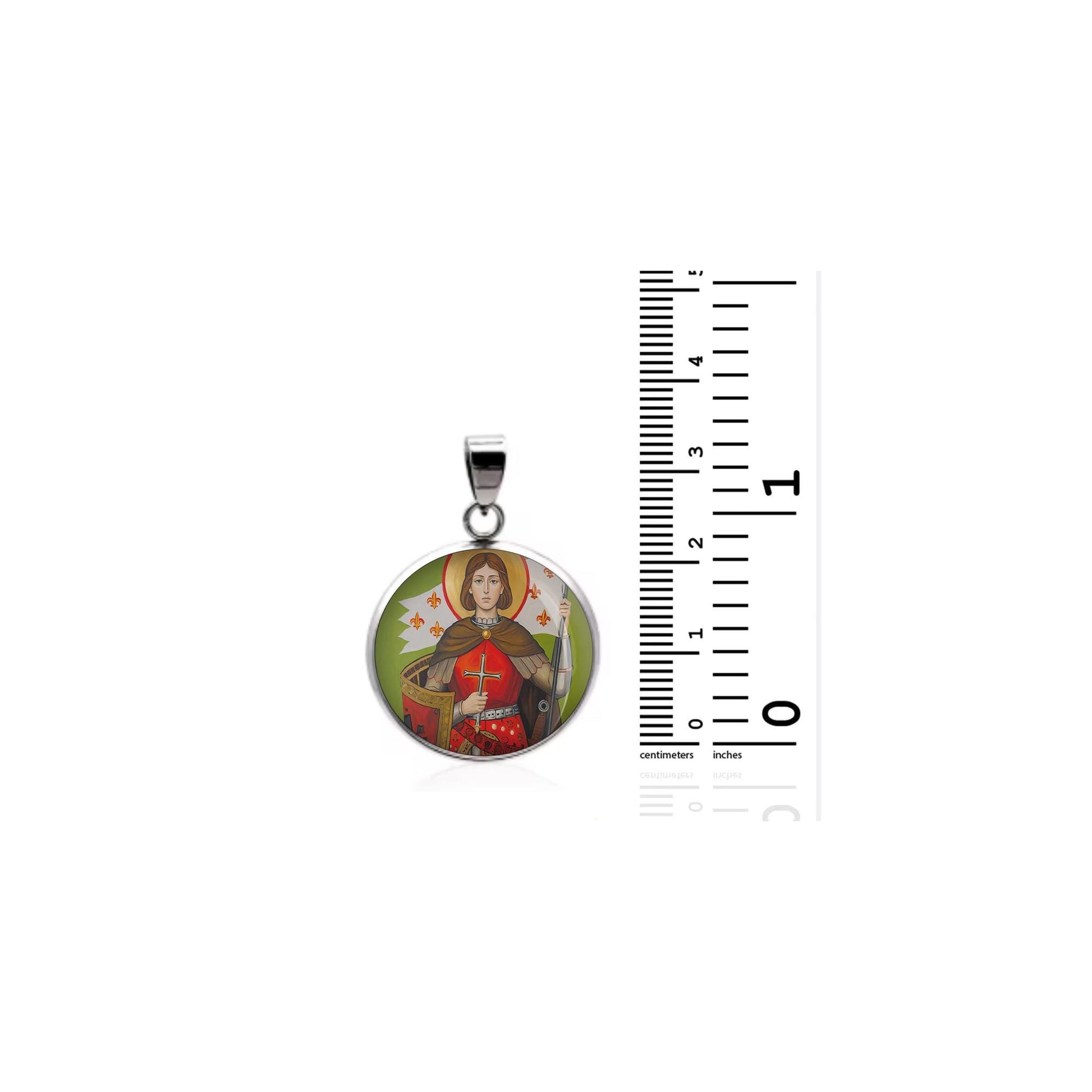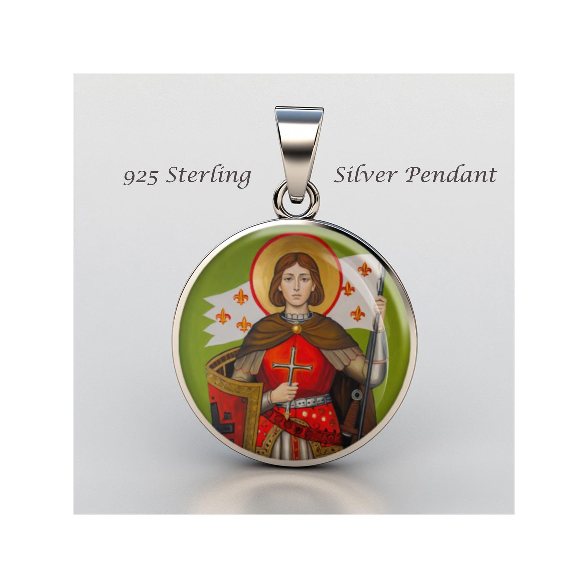 Dedicated to Saint Joan Of Arc, this 20mm sterling silver pendant features a delicate design under a clear glass dome, crafted with high-quality paper. The pendant comes in a beautiful jewelry box, ready for gifting—perfect for birthdays, anniversaries, Christmas, Easter, Baptism, First Communion, Confirmation, Mother's Day, or as a thoughtful gift for a loved one.