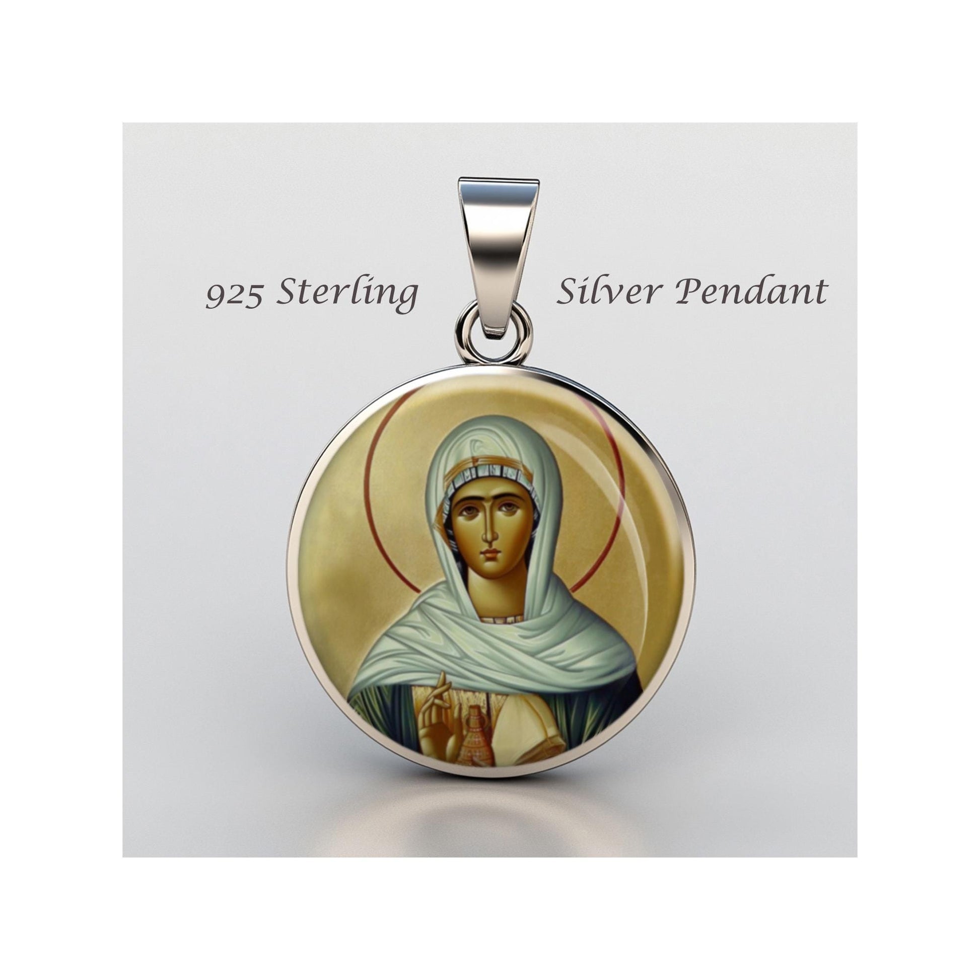 Dedicated to Saint Joanna The Myrrhbearer, this 20mm sterling silver pendant features a delicate design under a clear glass dome, crafted with high-quality paper. The pendant comes in a beautiful jewelry box, ready for gifting—perfect for birthdays, anniversaries, Christmas, Easter, Baptism, First Communion, Confirmation, Mother's Day, or as a thoughtful gift for a loved one.