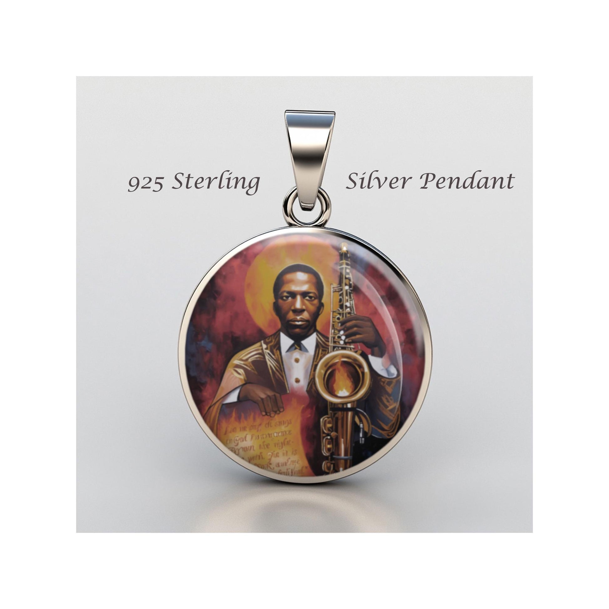 Dedicated to Saint John Coltrane, this 20mm sterling silver pendant features a delicate design under a clear glass dome, crafted with high-quality paper. The pendant comes in a beautiful jewelry box, ready for gifting—perfect for birthdays, anniversaries, Christmas, Easter, Baptism, First Communion, Confirmation, Mother's Day, or as a thoughtful gift for a loved one.