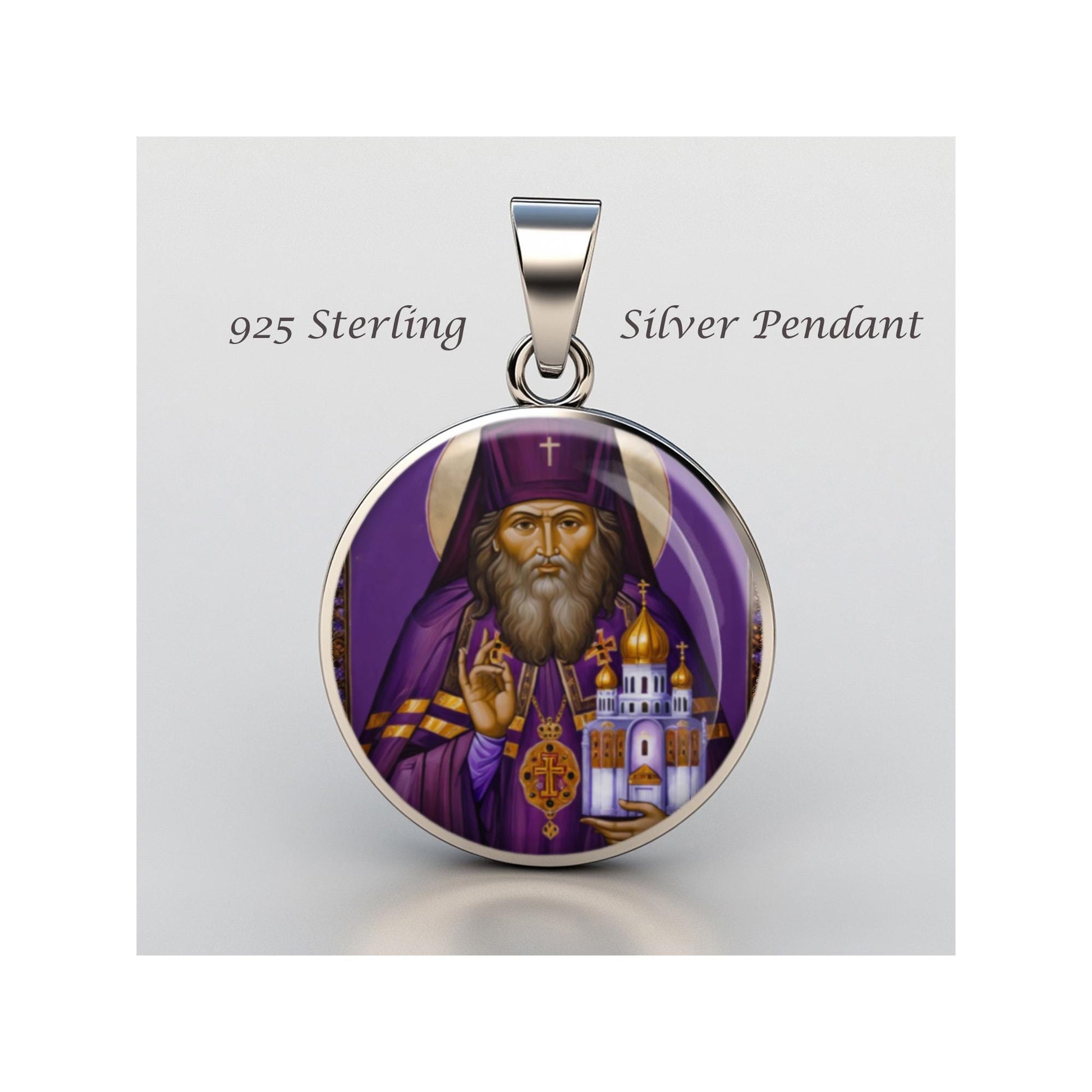 Dedicated to Saint John Maximovitch The Wonderworker, this 20mm sterling silver pendant features a delicate design under a clear glass dome, crafted with high-quality paper. The pendant comes in a beautiful jewelry box, ready for gifting—perfect for birthdays, anniversaries, Christmas, Easter, Baptism, First Communion, Confirmation, Mother's Day, or as a thoughtful gift for a loved one.