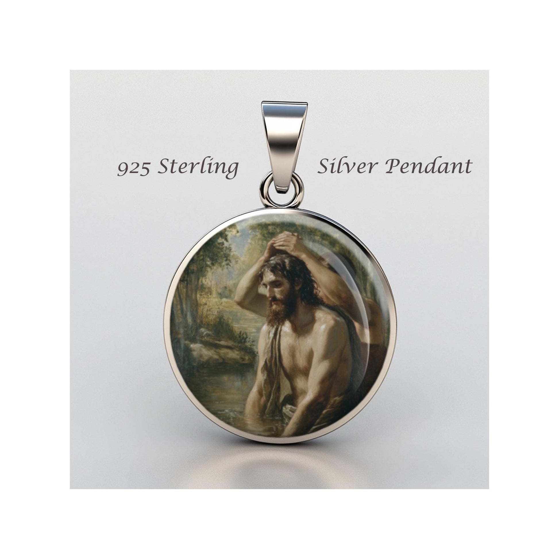 Dedicated to Saint John The Baptist Baptizing Jesus, this 20mm sterling silver pendant features a delicate design under a clear glass dome, crafted with high-quality paper. The pendant comes in a beautiful jewelry box, ready for gifting—perfect for birthdays, anniversaries, Christmas, Easter, Baptism, First Communion, Confirmation, Mother's Day, or as a thoughtful gift for a loved one.