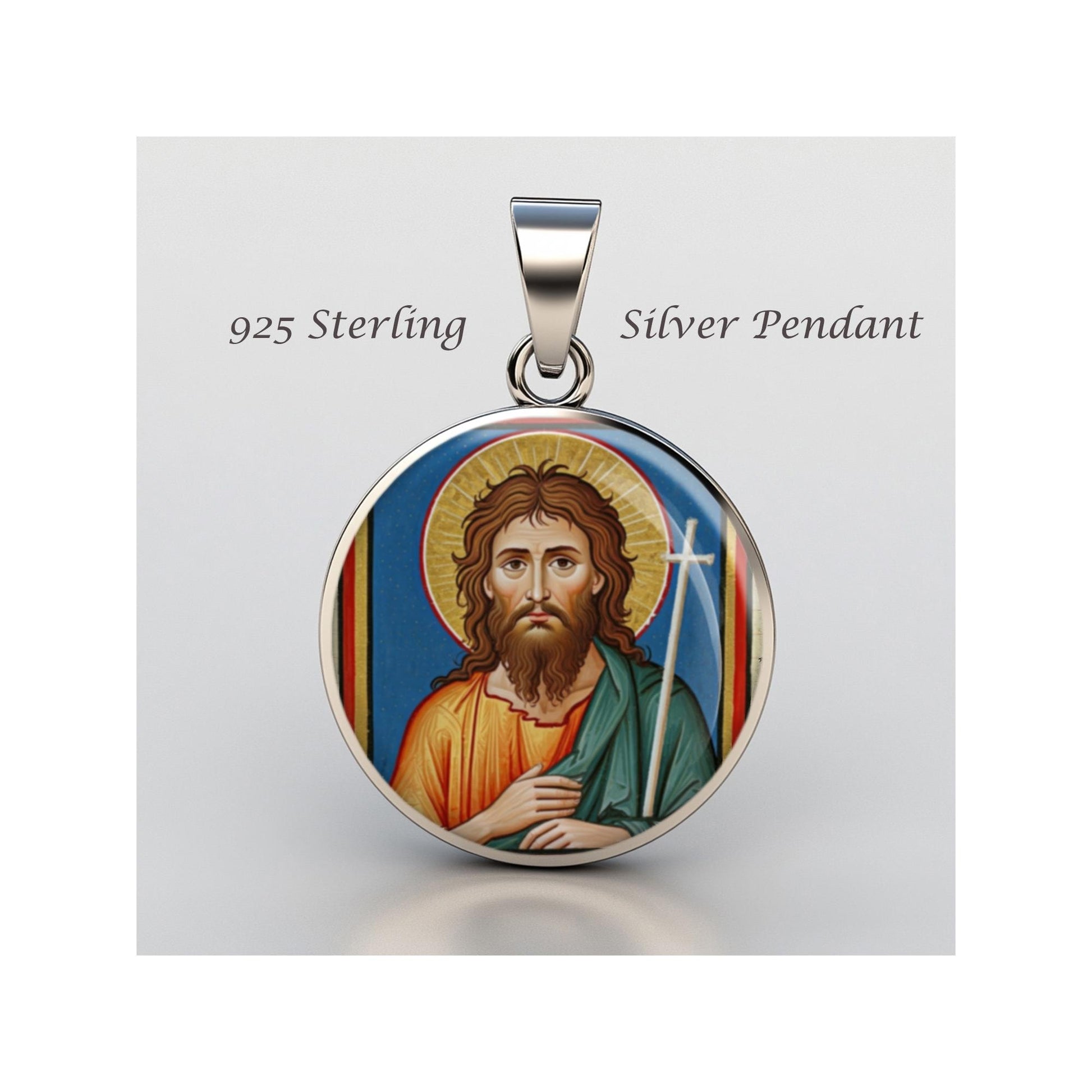 Dedicated to Saint John The Baptist, this 20mm sterling silver pendant features a delicate design under a clear glass dome, crafted with high-quality paper. The pendant comes in a beautiful jewelry box, ready for gifting—perfect for birthdays, anniversaries, Christmas, Easter, Baptism, First Communion, Confirmation, Mother's Day, or as a thoughtful gift for a loved one.