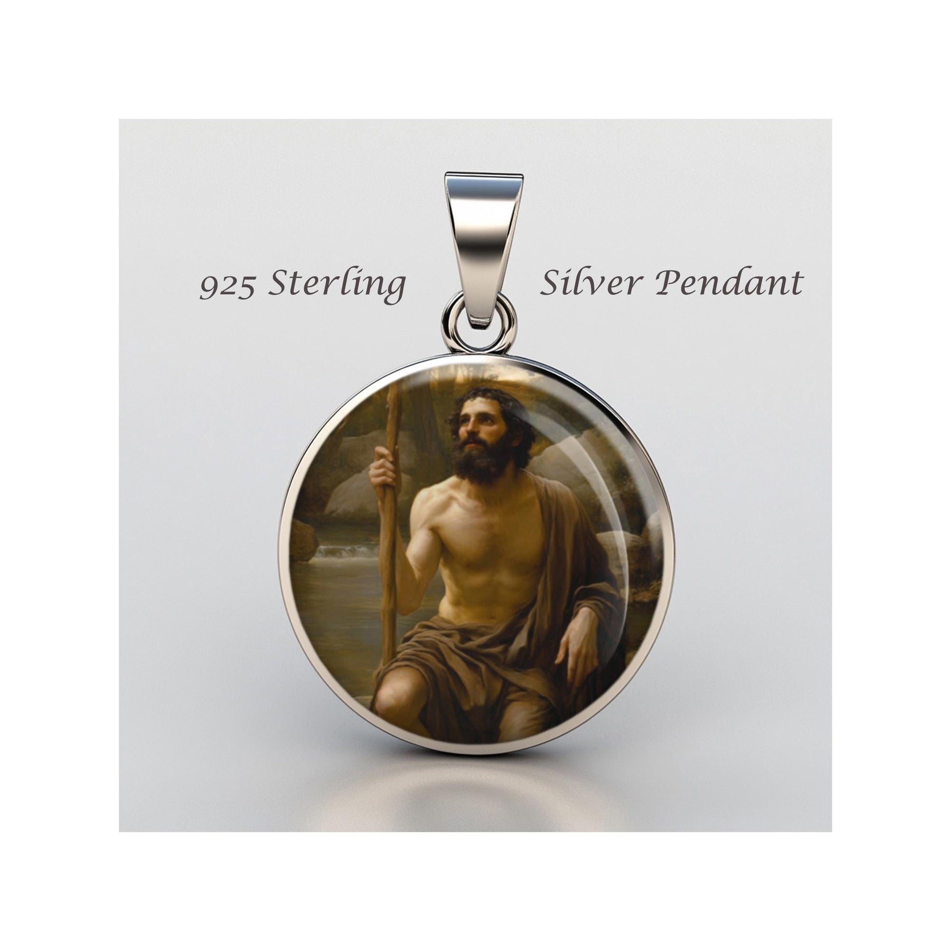 Dedicated to Saint John The Baptist, this 20mm sterling silver pendant features a delicate design under a clear glass dome, crafted with high-quality paper. The pendant comes in a beautiful jewelry box, ready for gifting—perfect for birthdays, anniversaries, Christmas, Easter, Baptism, First Communion, Confirmation, Mother's Day, or as a thoughtful gift for a loved one.