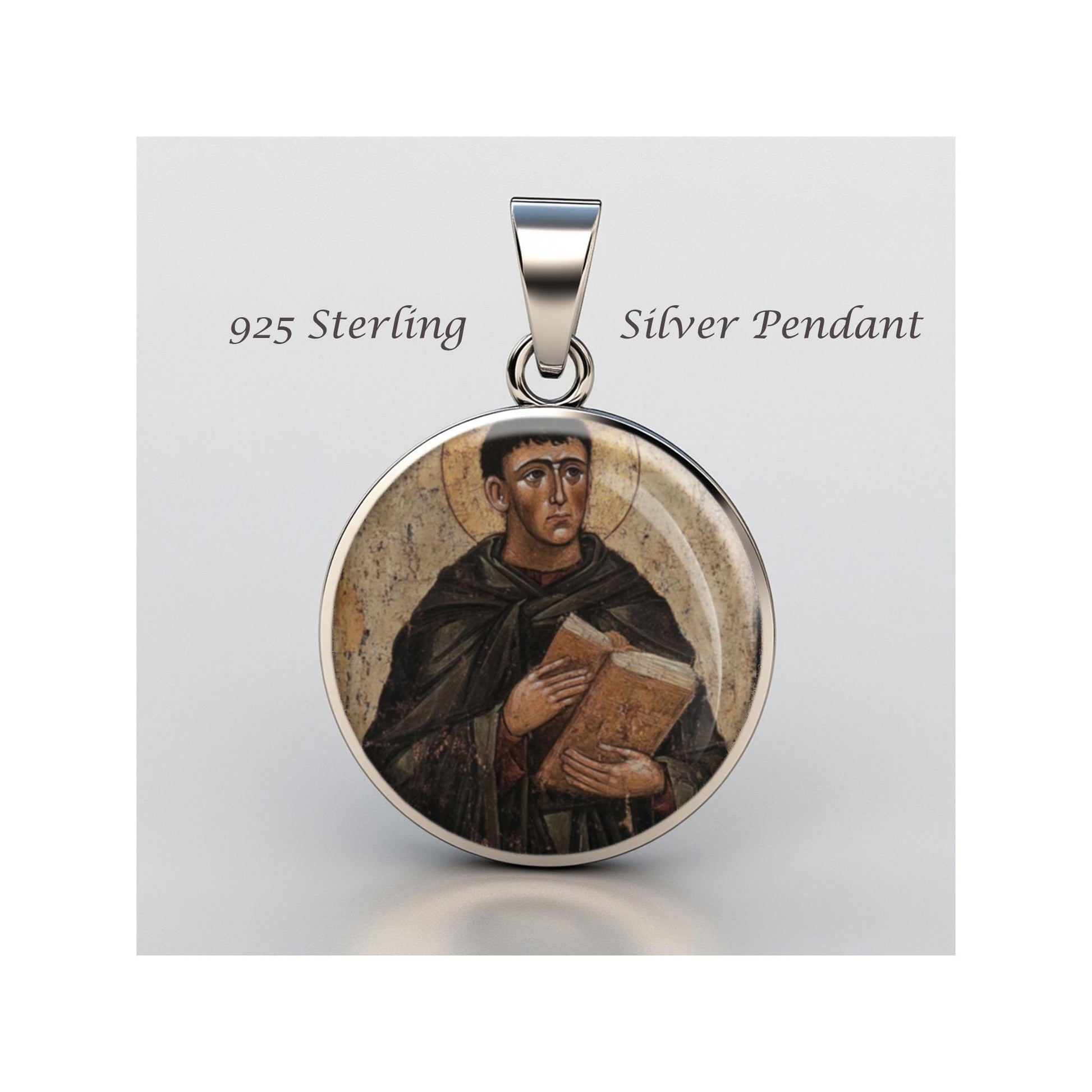 Dedicated to Saint John Theristu, this 20mm sterling silver pendant features a delicate design under a clear glass dome, crafted with high-quality paper. The pendant comes in a beautiful jewelry box, ready for gifting—perfect for birthdays, anniversaries, Christmas, Easter, Baptism, First Communion, Confirmation, Mother's Day, or as a thoughtful gift for a loved one.