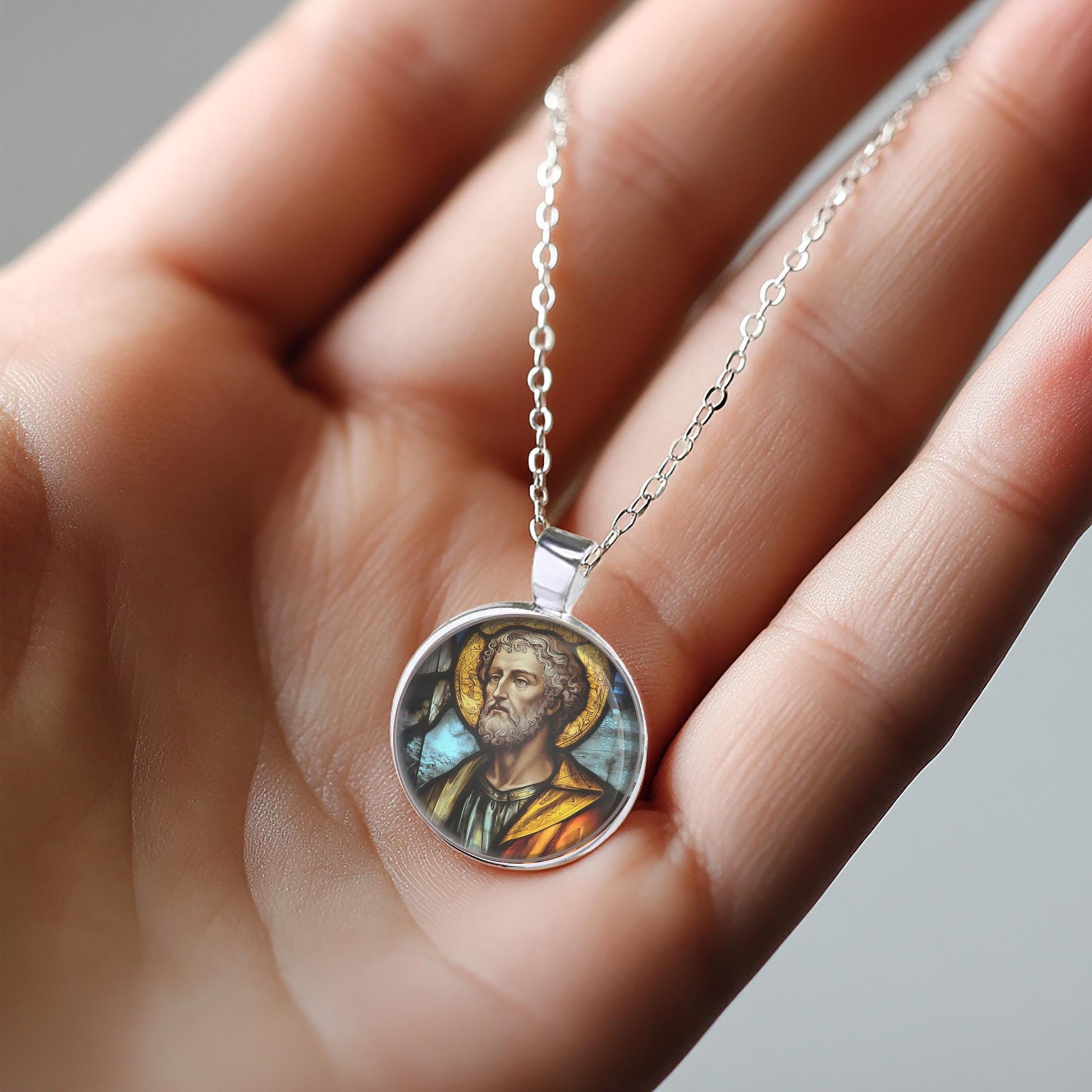 Saint Joseph Art Glass Necklace Medal Religious Pendant Bronze Silver