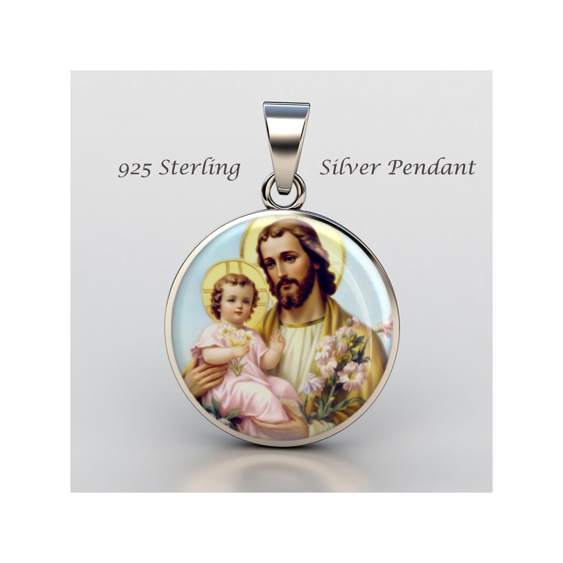 Dedicated to Saint Joseph Holding Baby Jesus With Lilies, this 20mm sterling silver pendant features a delicate design under a clear glass dome, crafted with high-quality paper. The pendant comes in a beautiful jewelry box, ready for gifting—perfect for birthdays, anniversaries, Christmas, Easter, Baptism, First Communion, Confirmation, Mother's Day, or as a thoughtful gift for a loved one.