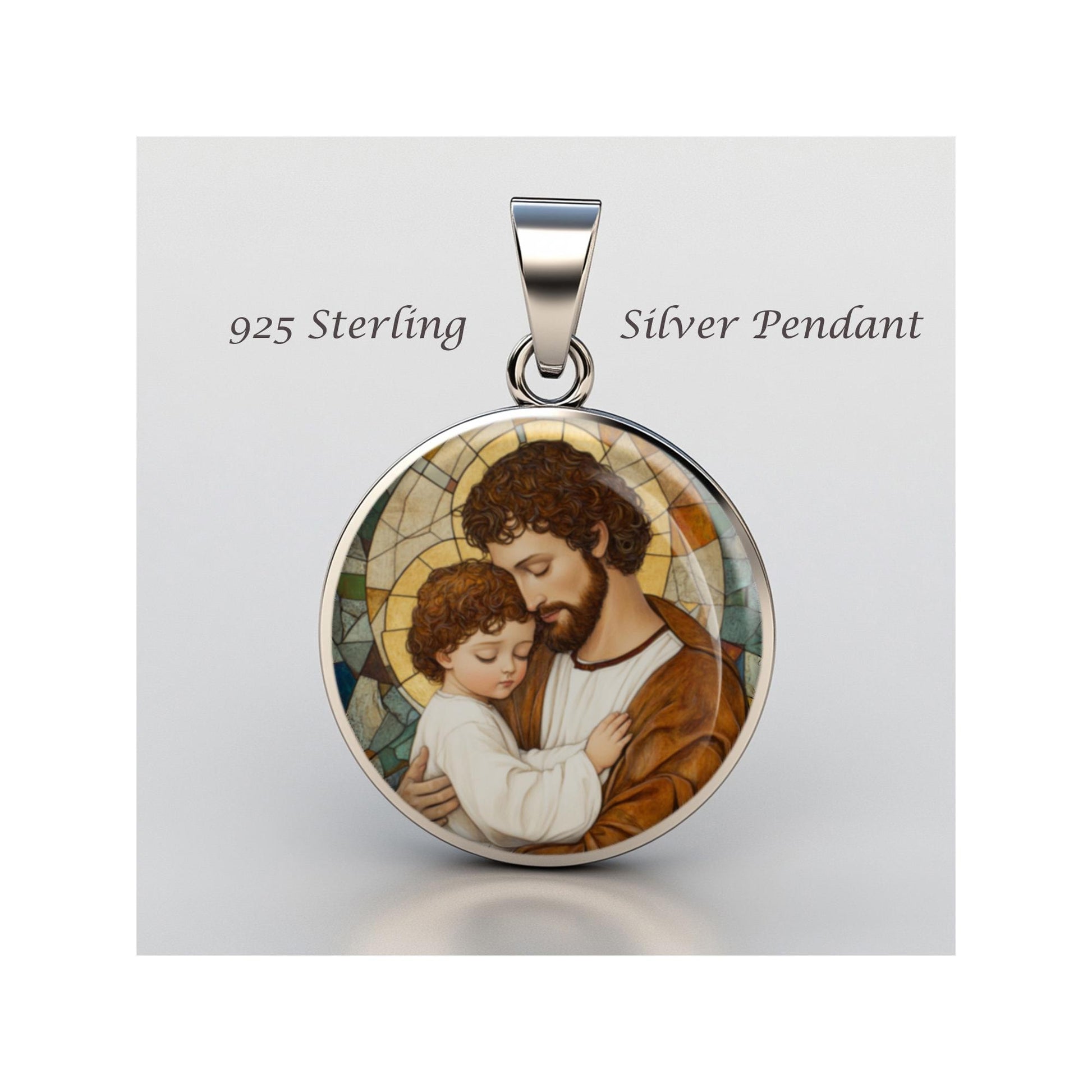 Dedicated to Saint Joseph Holding The Child Jesus In His Arms, this 20mm sterling silver pendant features a delicate design under a clear glass dome, crafted with high-quality paper. The pendant comes in a beautiful jewelry box, ready for gifting—perfect for birthdays, anniversaries, Christmas, Easter, Baptism, First Communion, Confirmation, Mother's Day, or as a thoughtful gift for a loved one.