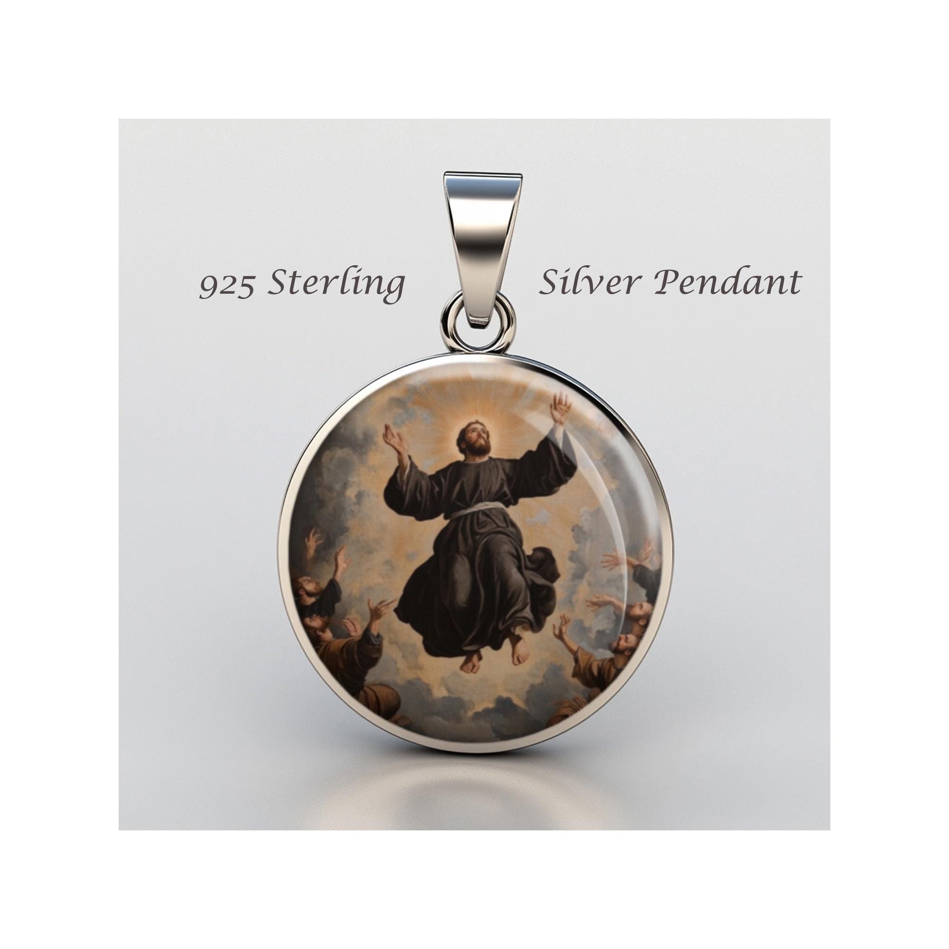 Dedicated to Saint Joseph Of Cupertino, this 20mm sterling silver pendant features a delicate design under a clear glass dome, crafted with high-quality paper. The pendant comes in a beautiful jewelry box, ready for gifting—perfect for birthdays, anniversaries, Christmas, Easter, Baptism, First Communion, Confirmation, Mother's Day, or as a thoughtful gift for a loved one.