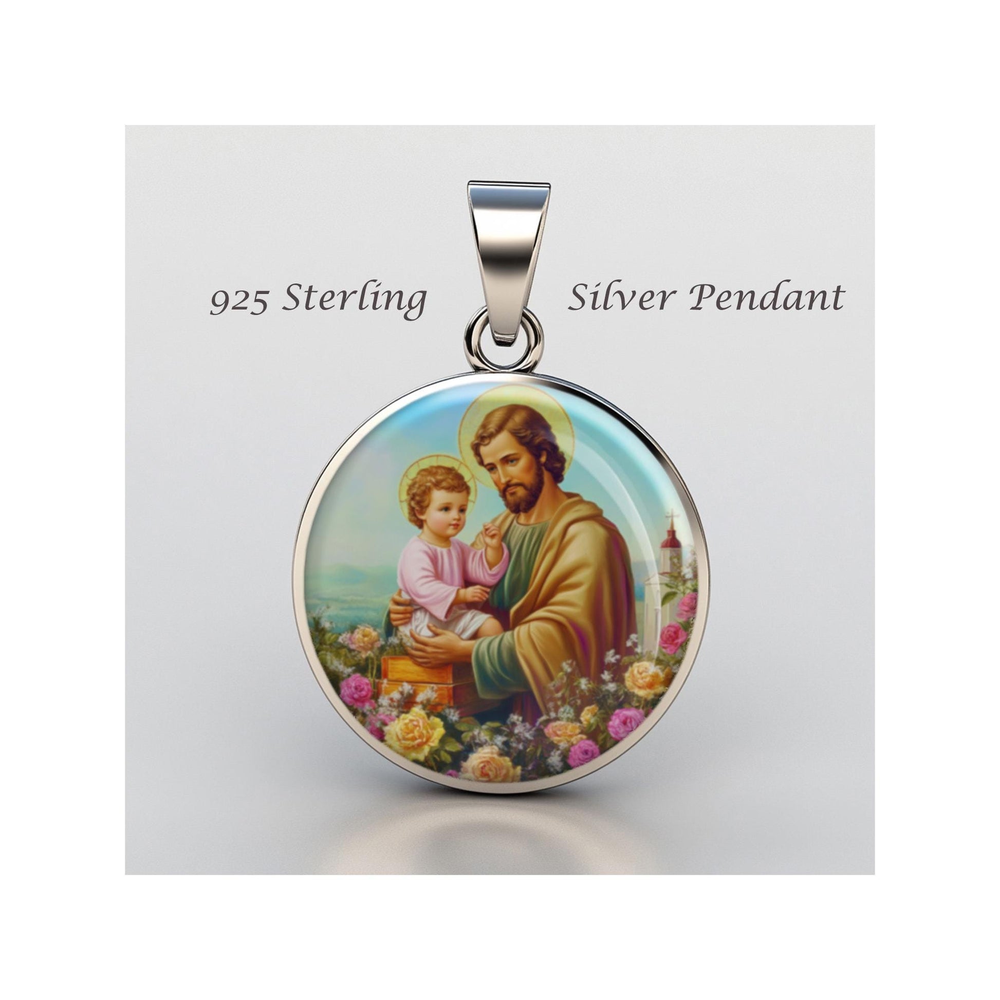 Dedicated to Saint Joseph With Baby Jesus And Roses, this 20mm sterling silver pendant features a delicate design under a clear glass dome, crafted with high-quality paper. The pendant comes in a beautiful jewelry box, ready for gifting—perfect for birthdays, anniversaries, Christmas, Easter, Baptism, First Communion, Confirmation, Mother's Day, or as a thoughtful gift for a loved one.