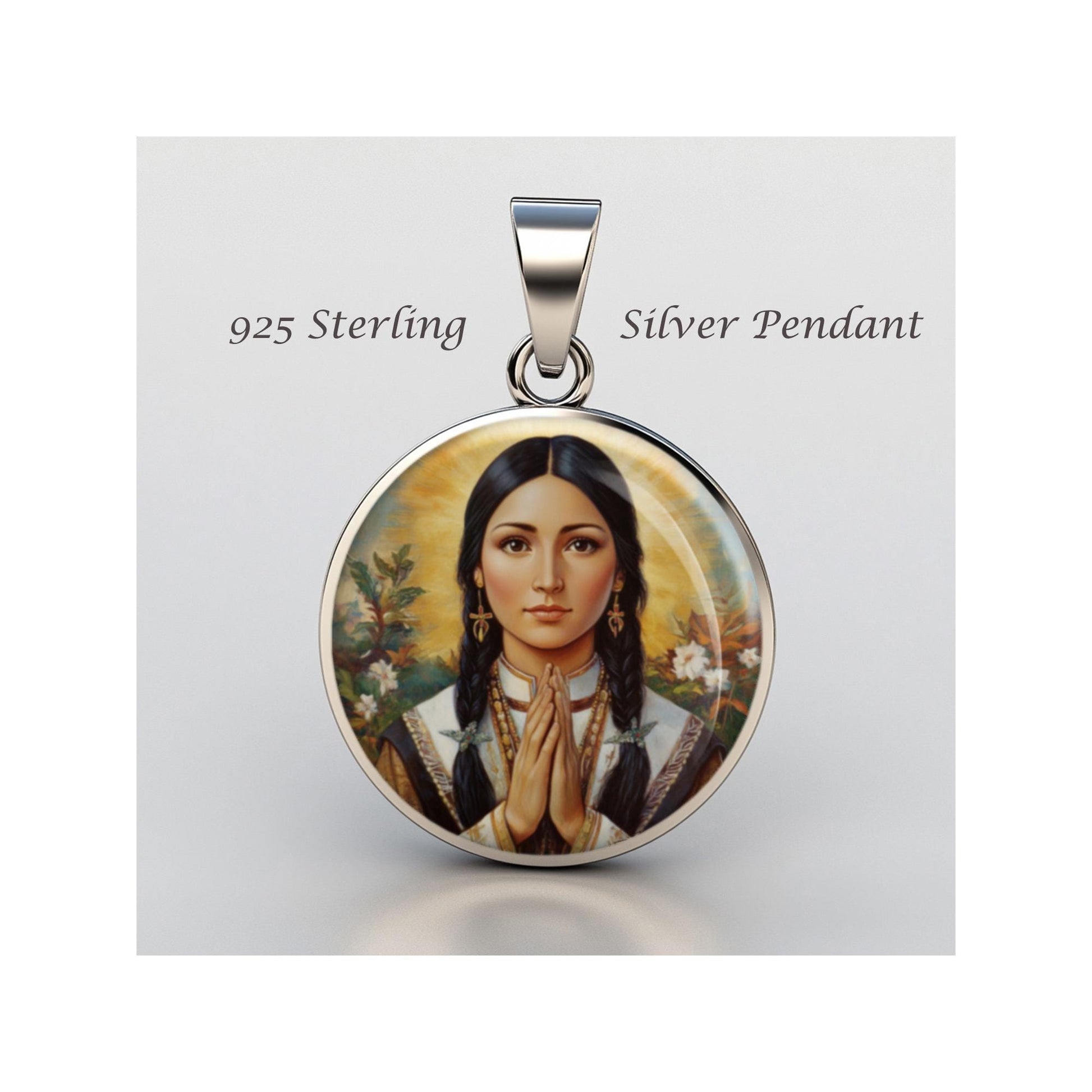 Dedicated to Saint Kateri Tekakwitha, this 20mm sterling silver pendant features a delicate design under a clear glass dome, crafted with high-quality paper. The pendant comes in a beautiful jewelry box, ready for gifting—perfect for birthdays, anniversaries, Christmas, Easter, Baptism, First Communion, Confirmation, Mother's Day, or as a thoughtful gift for a loved one.