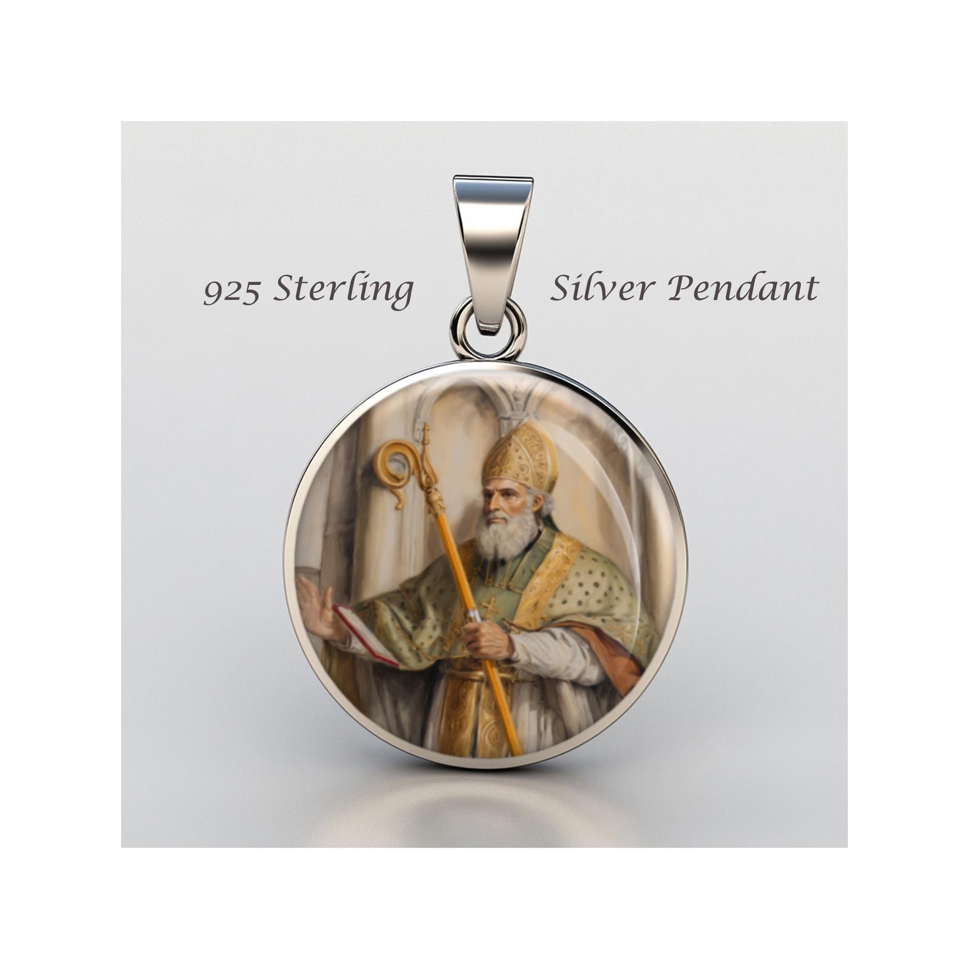 Dedicated to Saint Leodegar, this 20mm sterling silver pendant features a delicate design under a clear glass dome, crafted with high-quality paper. The pendant comes in a beautiful jewelry box, ready for gifting—perfect for birthdays, anniversaries, Christmas, Easter, Baptism, First Communion, Confirmation, Mother's Day, or as a thoughtful gift for a loved one.