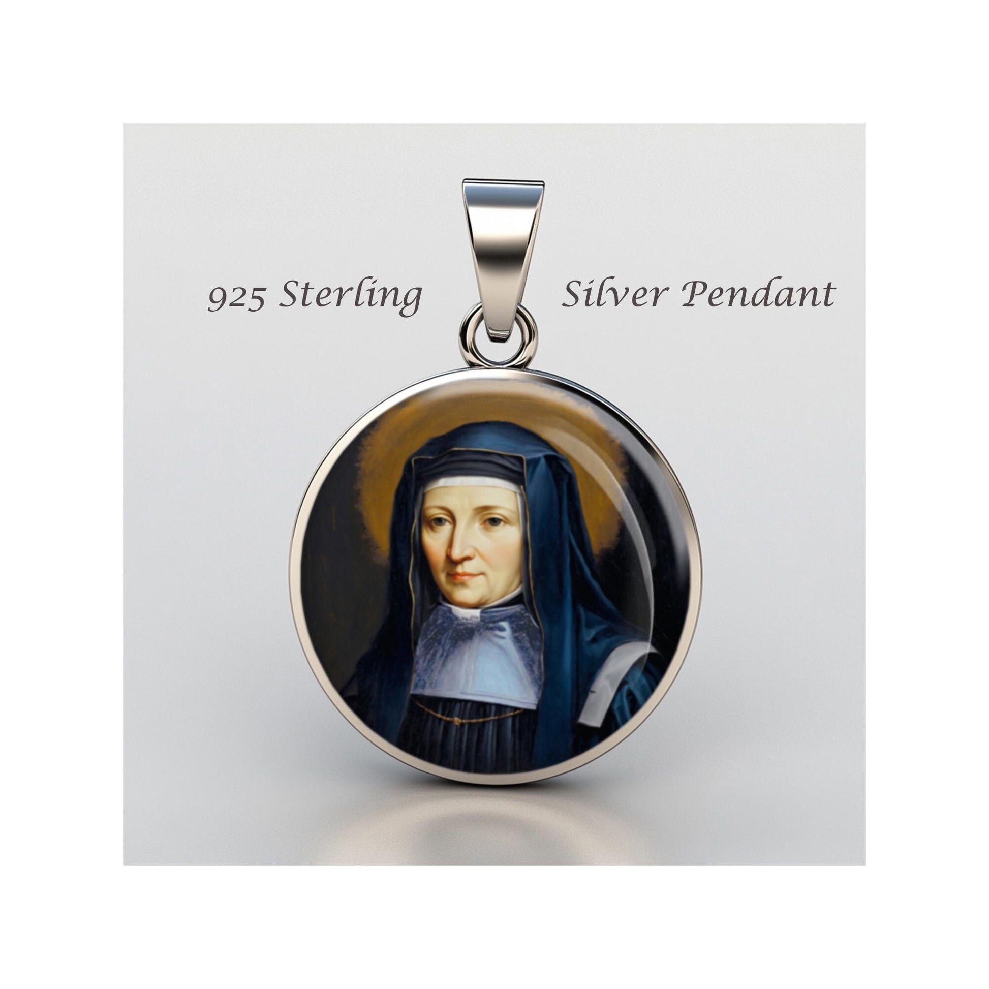 Dedicated to Saint Louise De Marillac, this 20mm sterling silver pendant features a delicate design under a clear glass dome, crafted with high-quality paper. The pendant comes in a beautiful jewelry box, ready for gifting—perfect for birthdays, anniversaries, Christmas, Easter, Baptism, First Communion, Confirmation, Mother's Day, or as a thoughtful gift for a loved one.