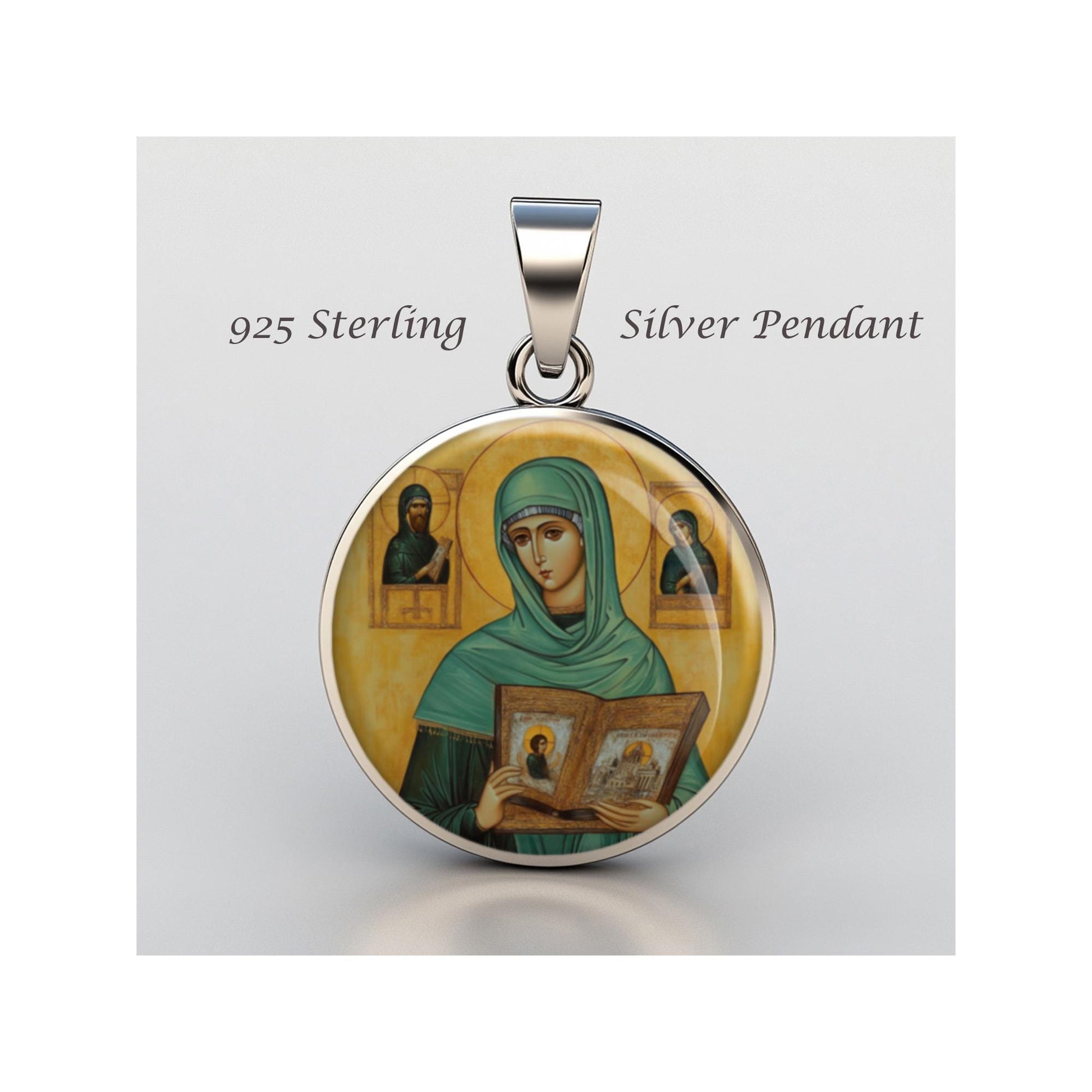 Dedicated to Saint Macrina The Younger, this 20mm sterling silver pendant features a delicate design under a clear glass dome, crafted with high-quality paper. The pendant comes in a beautiful jewelry box, ready for gifting—perfect for birthdays, anniversaries, Christmas, Easter, Baptism, First Communion, Confirmation, Mother's Day, or as a thoughtful gift for a loved one.