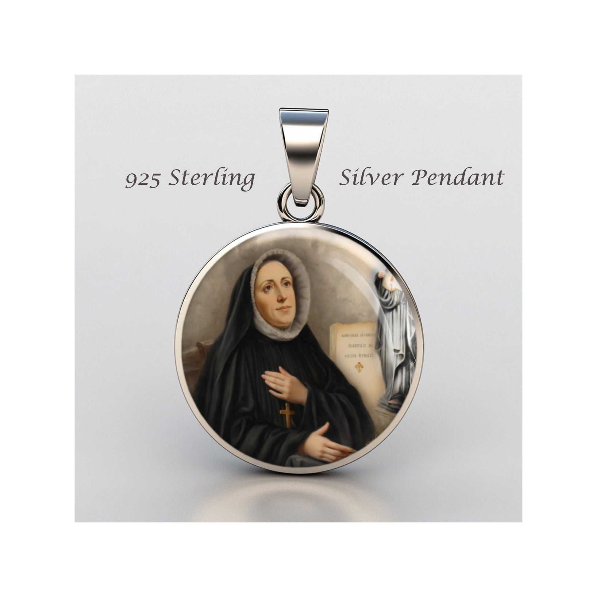 Dedicated to Saint Madeline Sophie Barat, this 20mm sterling silver pendant features a delicate design under a clear glass dome, crafted with high-quality paper. The pendant comes in a beautiful jewelry box, ready for gifting—perfect for birthdays, anniversaries, Christmas, Easter, Baptism, First Communion, Confirmation, Mother's Day, or as a thoughtful gift for a loved one.