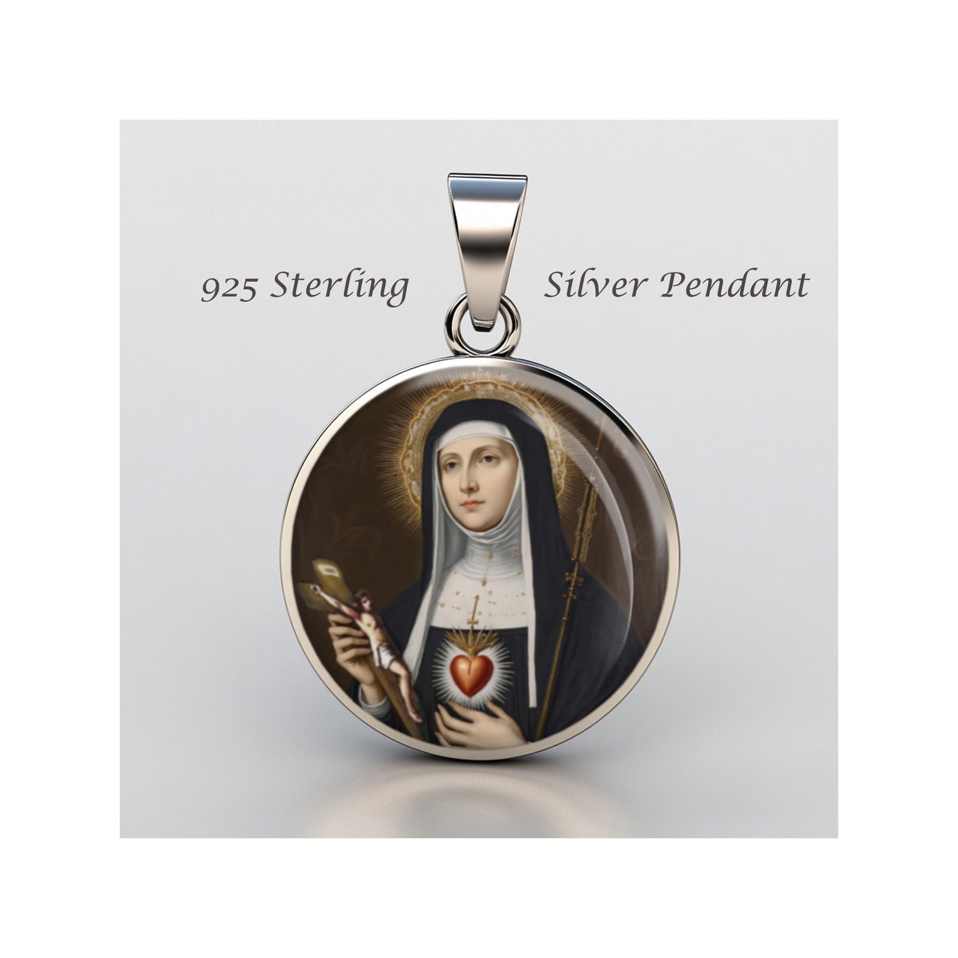 Dedicated to Saint Margaret Mary Alacoque, this 20mm sterling silver pendant features a delicate design under a clear glass dome, crafted with high-quality paper. The pendant comes in a beautiful jewelry box, ready for gifting—perfect for birthdays, anniversaries, Christmas, Easter, Baptism, First Communion, Confirmation, Mother's Day, or as a thoughtful gift for a loved one.