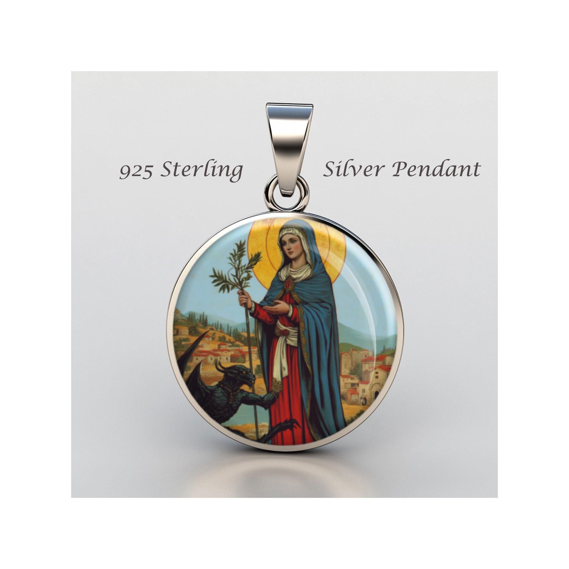 Dedicated to Saint Margaret, this 20mm sterling silver pendant features a delicate design under a clear glass dome, crafted with high-quality paper. The pendant comes in a beautiful jewelry box, ready for gifting—perfect for birthdays, anniversaries, Christmas, Easter, Baptism, First Communion, Confirmation, Mother's Day, or as a thoughtful gift for a loved one.