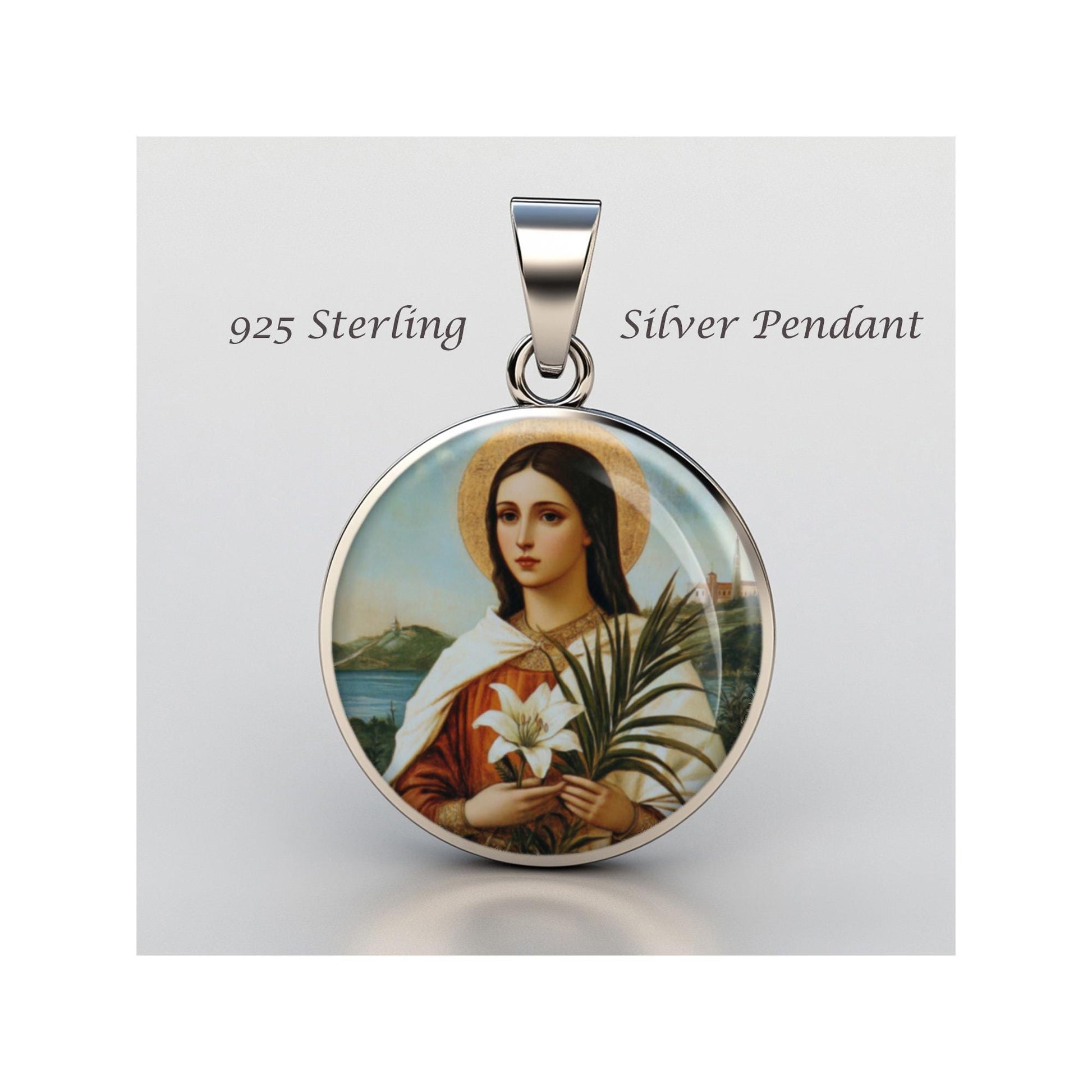 Dedicated to Saint Maria Goretti, this 20mm sterling silver pendant features a delicate design under a clear glass dome, crafted with high-quality paper. The pendant comes in a beautiful jewelry box, ready for gifting—perfect for birthdays, anniversaries, Christmas, Easter, Baptism, First Communion, Confirmation, Mother's Day, or as a thoughtful gift for a loved one.