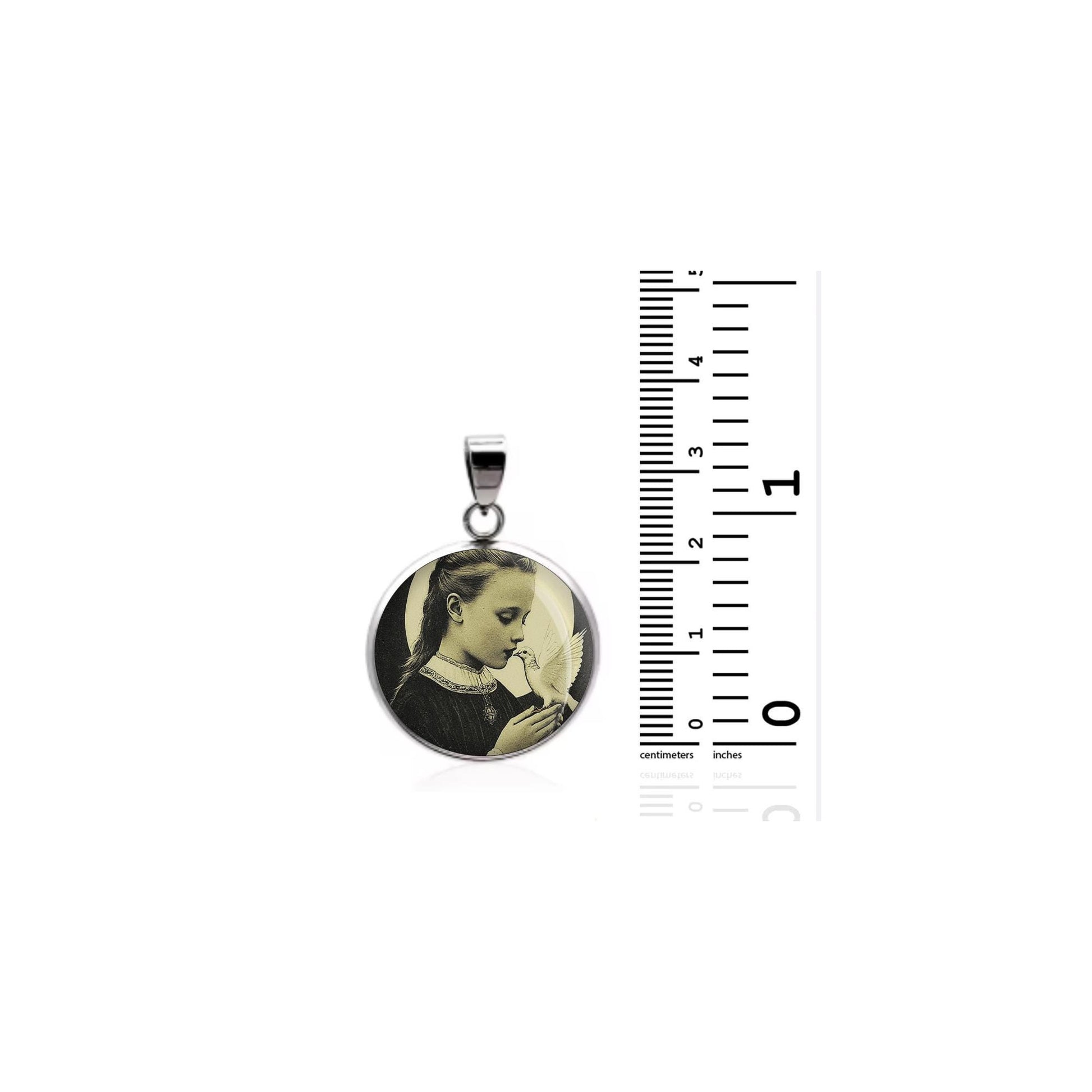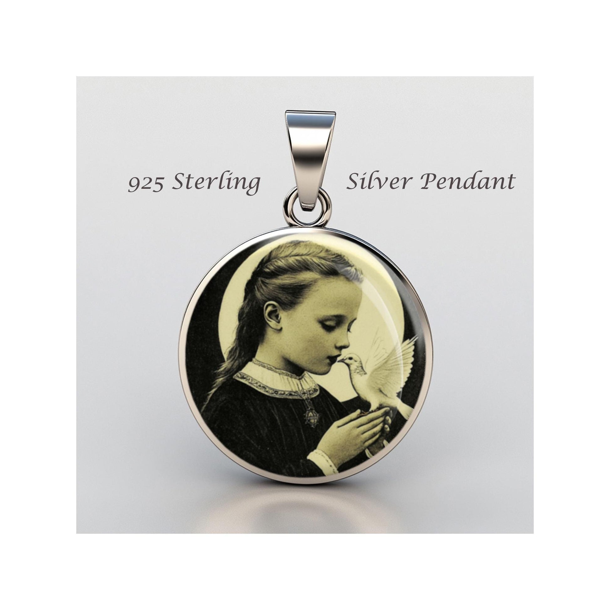 Dedicated to Saint Maria Goretti With Dove, this 20mm sterling silver pendant features a delicate design under a clear glass dome, crafted with high-quality paper. The pendant comes in a beautiful jewelry box, ready for gifting—perfect for birthdays, anniversaries, Christmas, Easter, Baptism, First Communion, Confirmation, Mother's Day, or as a thoughtful gift for a loved one.