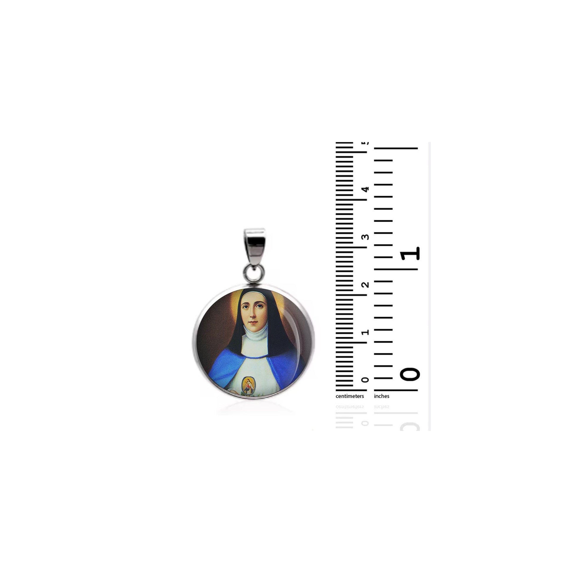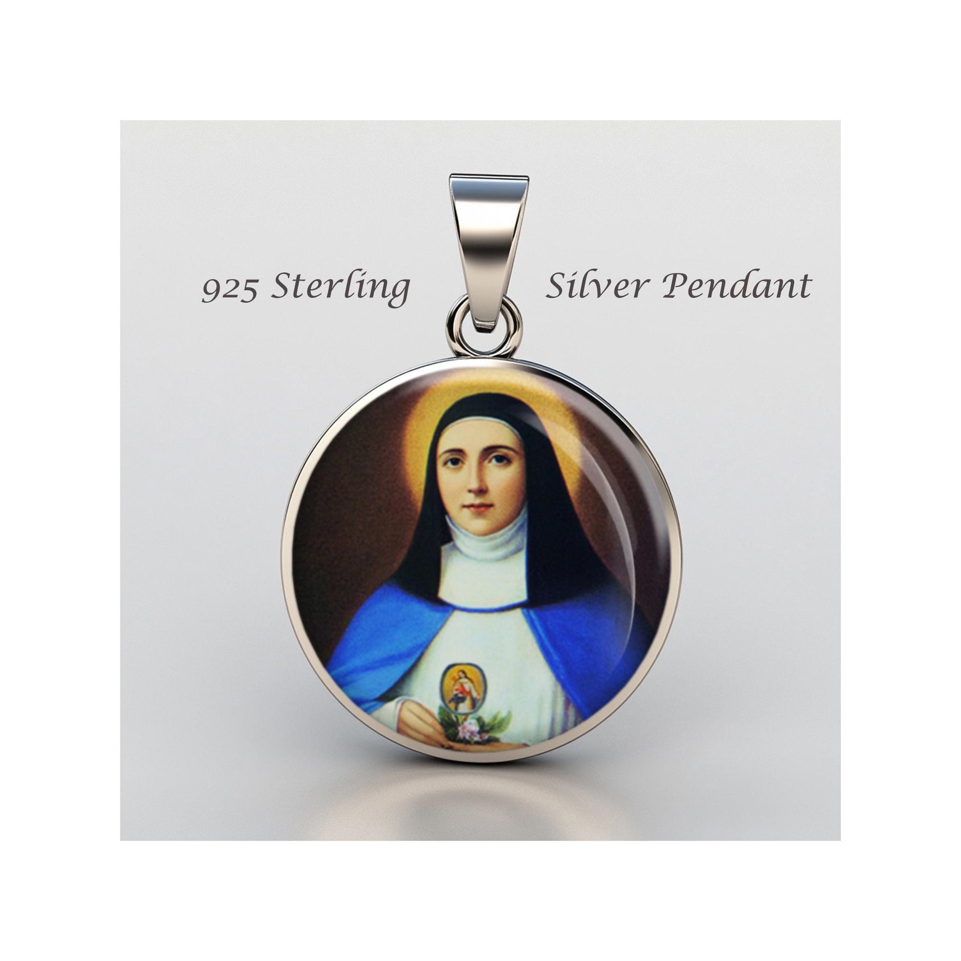 Dedicated to Saint Mariana De Jesus Torres, this 20mm sterling silver pendant features a delicate design under a clear glass dome, crafted with high-quality paper. The pendant comes in a beautiful jewelry box, ready for gifting—perfect for birthdays, anniversaries, Christmas, Easter, Baptism, First Communion, Confirmation, Mother's Day, or as a thoughtful gift for a loved one.