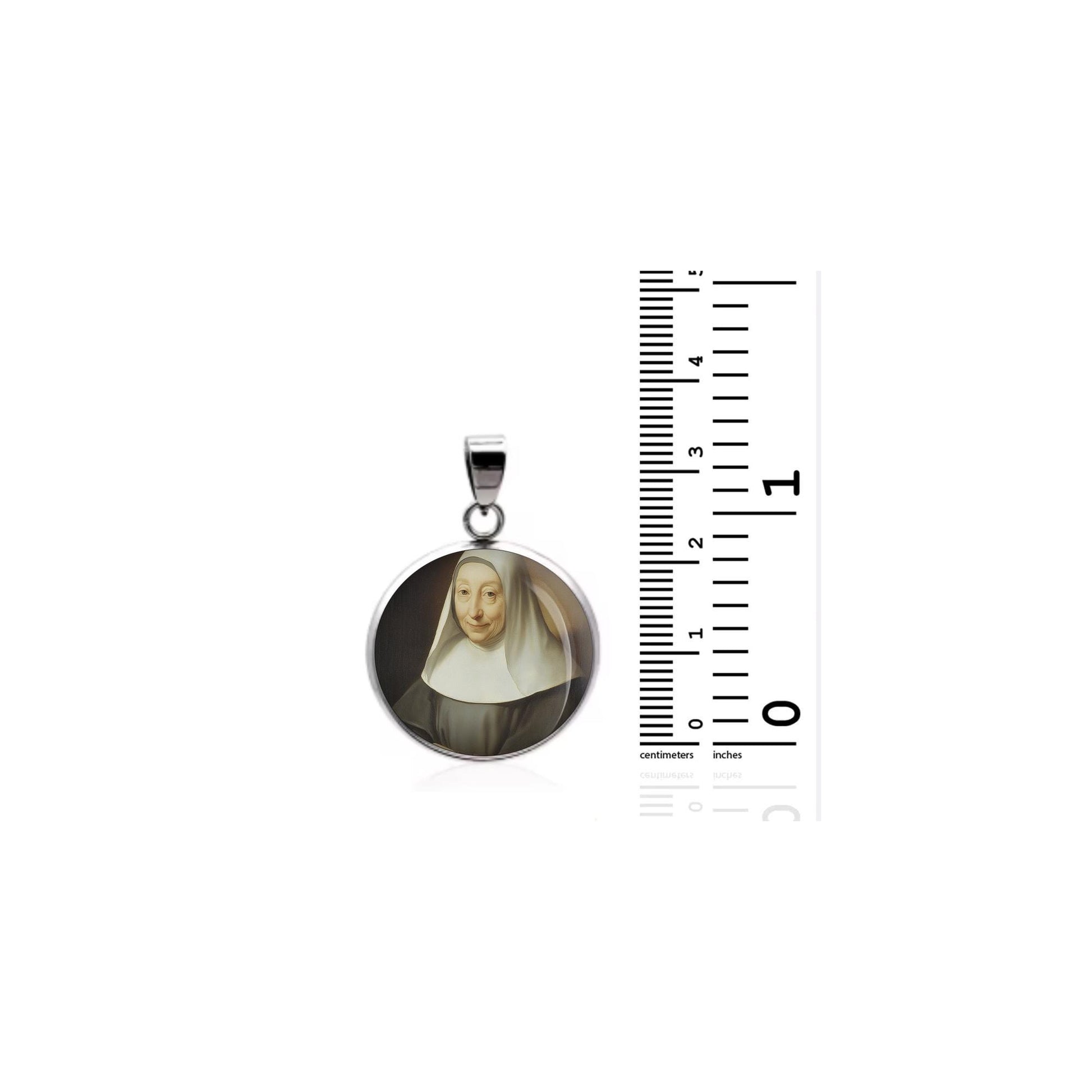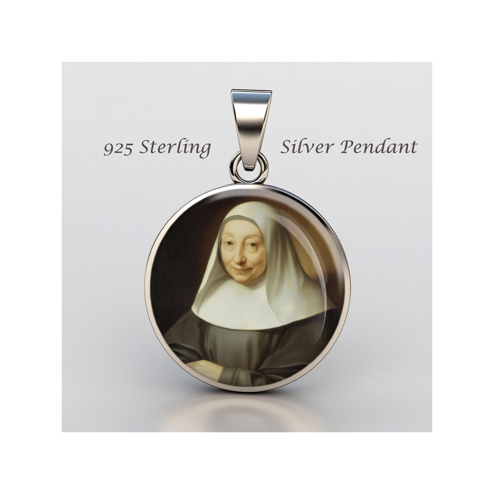 Dedicated to Saint Marie Poussepin, this 20mm sterling silver pendant features a delicate design under a clear glass dome, crafted with high-quality paper. The pendant comes in a beautiful jewelry box, ready for gifting—perfect for birthdays, anniversaries, Christmas, Easter, Baptism, First Communion, Confirmation, Mother's Day, or as a thoughtful gift for a loved one.