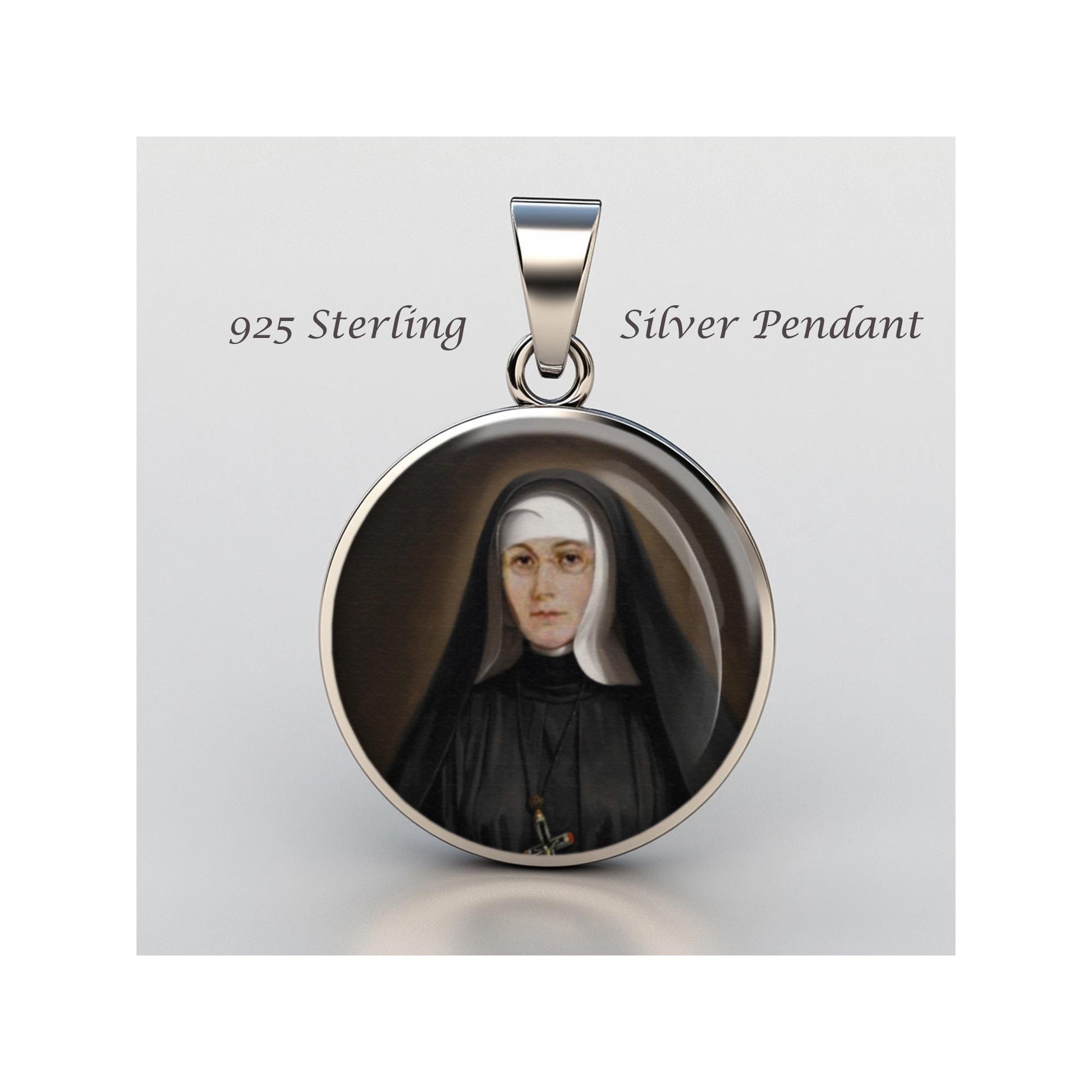 Dedicated to Saint Marie Rose Durocher Blessed, this 20mm sterling silver pendant features a delicate design under a clear glass dome, crafted with high-quality paper. The pendant comes in a beautiful jewelry box, ready for gifting—perfect for birthdays, anniversaries, Christmas, Easter, Baptism, First Communion, Confirmation, Mother's Day, or as a thoughtful gift for a loved one.