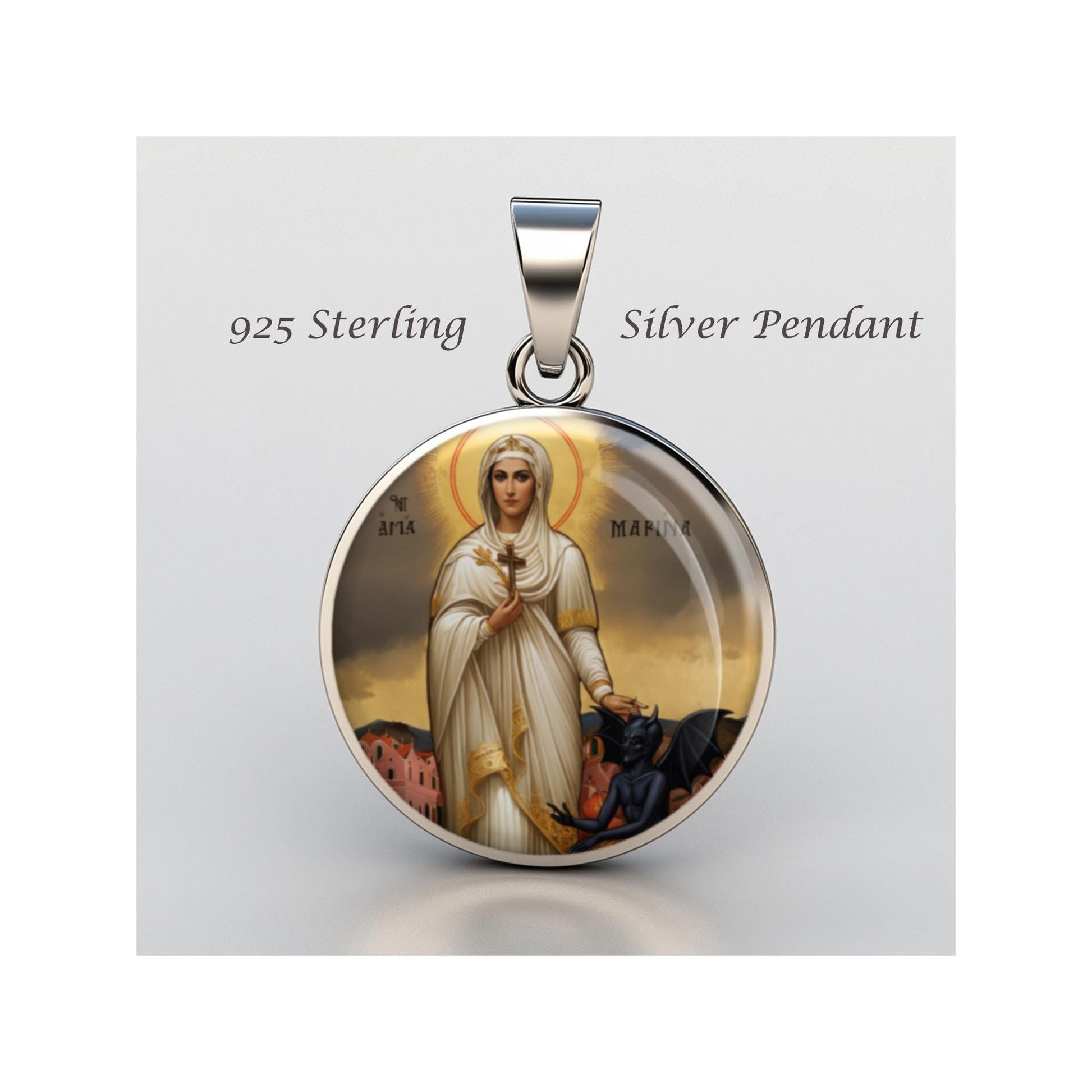 Dedicated to Saint Marina With Evil, this 20mm sterling silver pendant features a delicate design under a clear glass dome, crafted with high-quality paper. The pendant comes in a beautiful jewelry box, ready for gifting—perfect for birthdays, anniversaries, Christmas, Easter, Baptism, First Communion, Confirmation, Mother's Day, or as a thoughtful gift for a loved one.