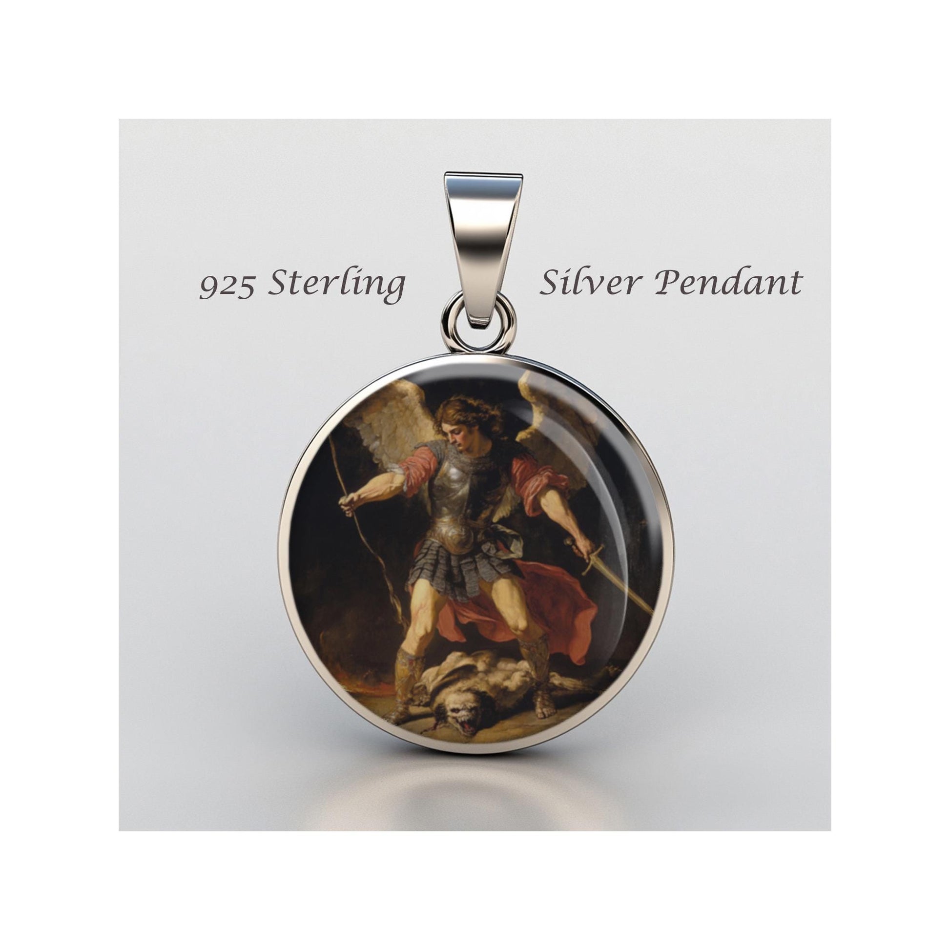 Dedicated to Saint Michael Slaying A Demon, this 20mm sterling silver pendant features a delicate design under a clear glass dome, crafted with high-quality paper. The pendant comes in a beautiful jewelry box, ready for gifting—perfect for birthdays, anniversaries, Christmas, Easter, Baptism, First Communion, Confirmation, Mother's Day, or as a thoughtful gift for a loved one.