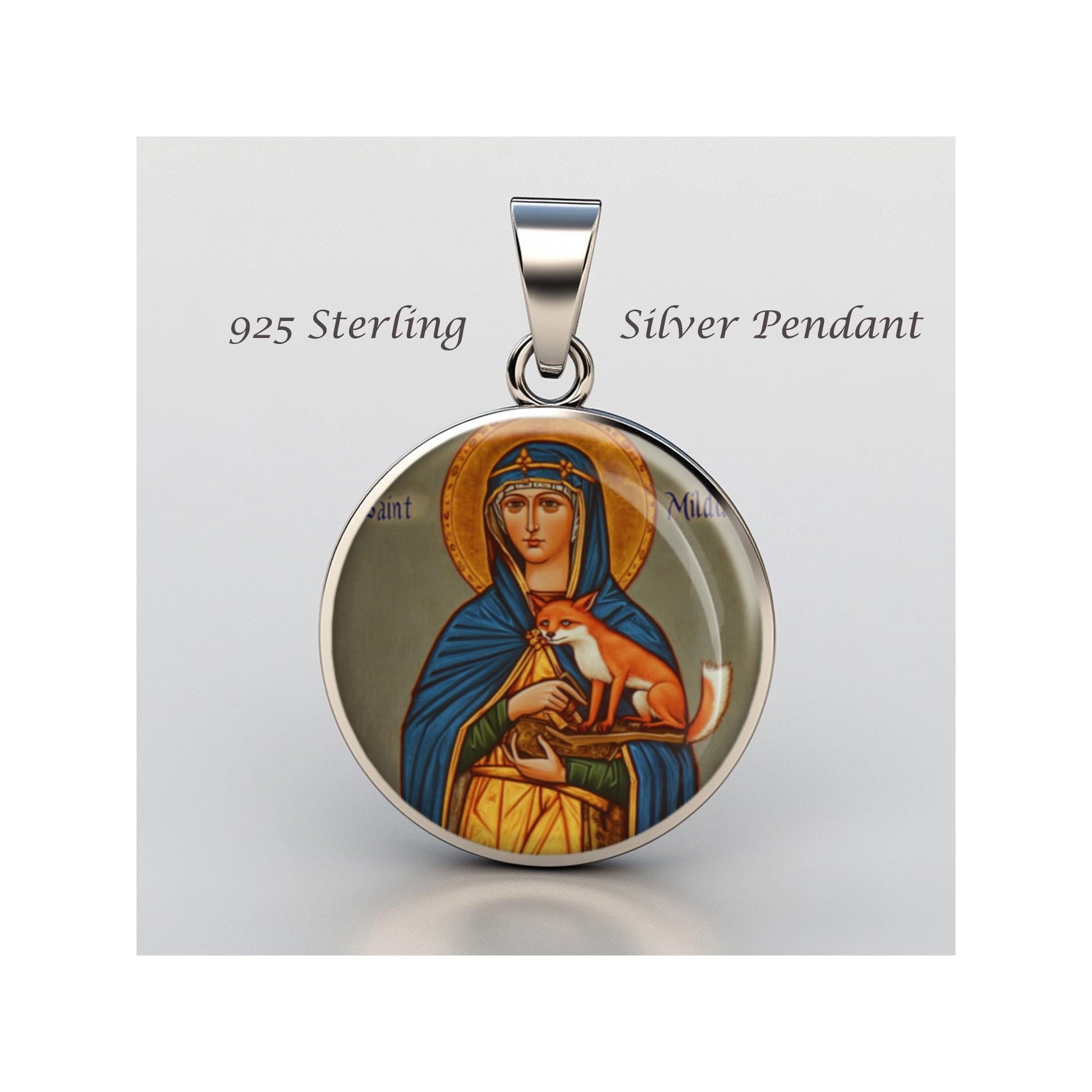 Dedicated to Saint Mildred, this 20mm sterling silver pendant features a delicate design under a clear glass dome, crafted with high-quality paper. The pendant comes in a beautiful jewelry box, ready for gifting—perfect for birthdays, anniversaries, Christmas, Easter, Baptism, First Communion, Confirmation, Mother's Day, or as a thoughtful gift for a loved one.