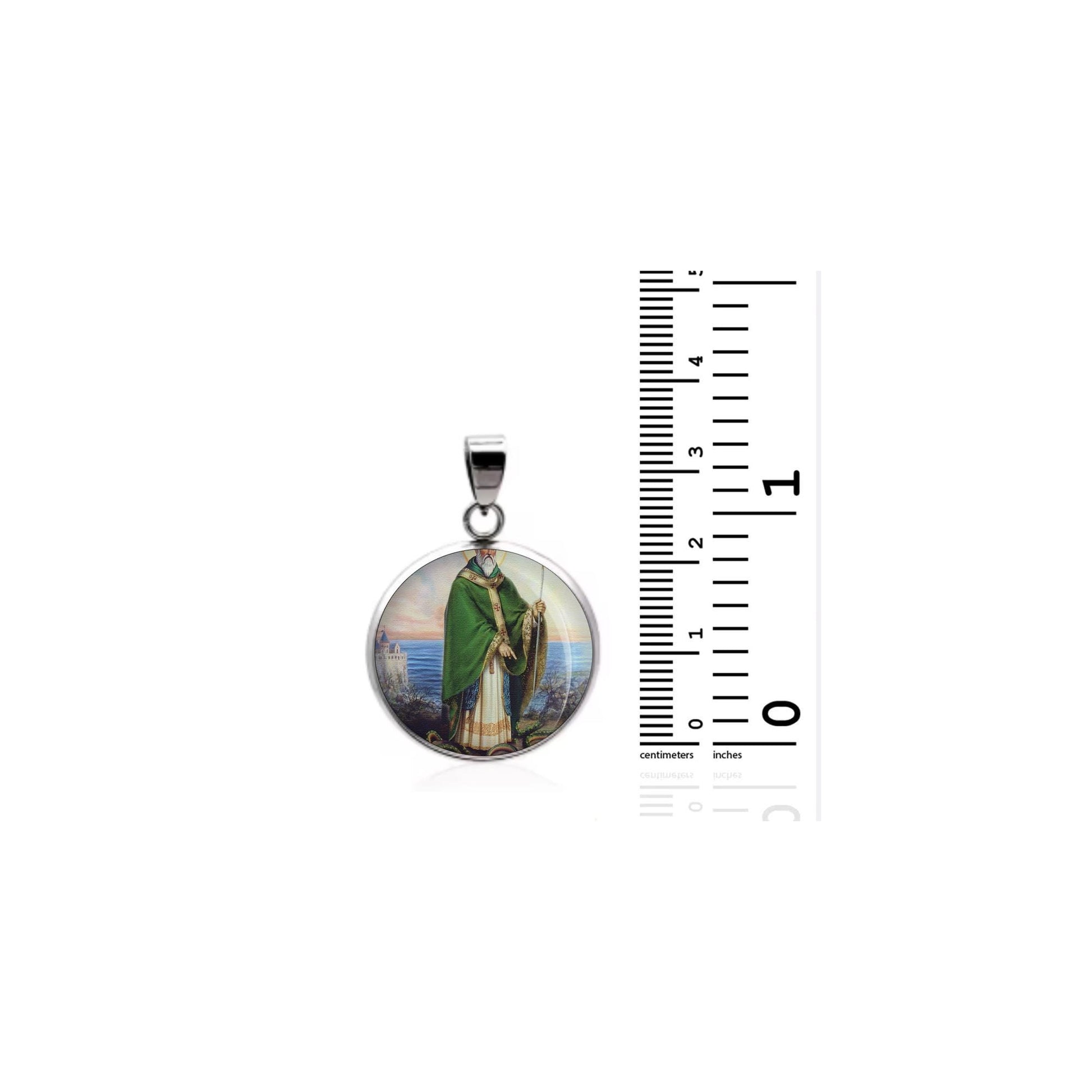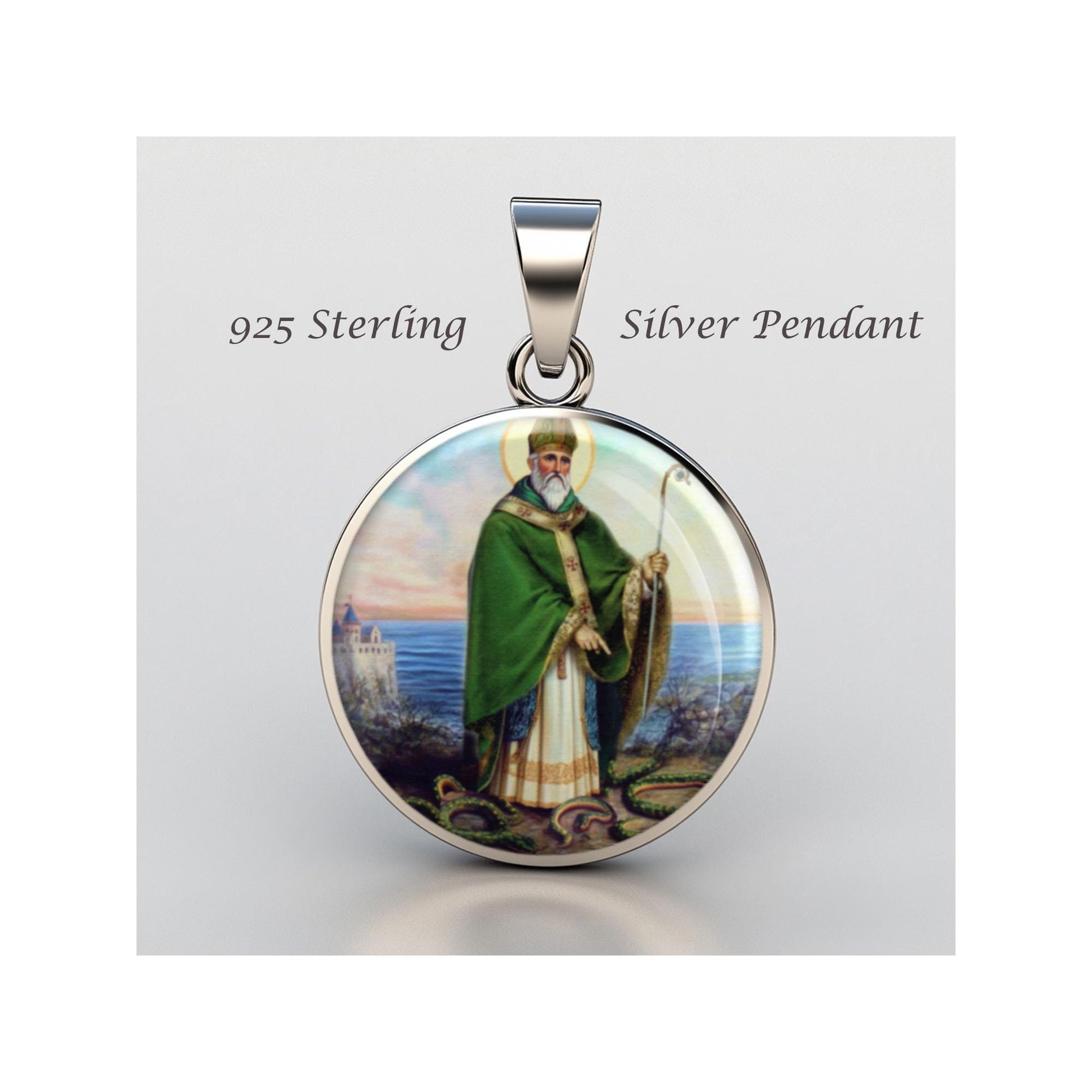 Dedicated to Saint Patrick, this 20mm sterling silver pendant features a delicate design under a clear glass dome, crafted with high-quality paper. The pendant comes in a beautiful jewelry box, ready for gifting—perfect for birthdays, anniversaries, Christmas, Easter, Baptism, First Communion, Confirmation, Mother's Day, or as a thoughtful gift for a loved one.