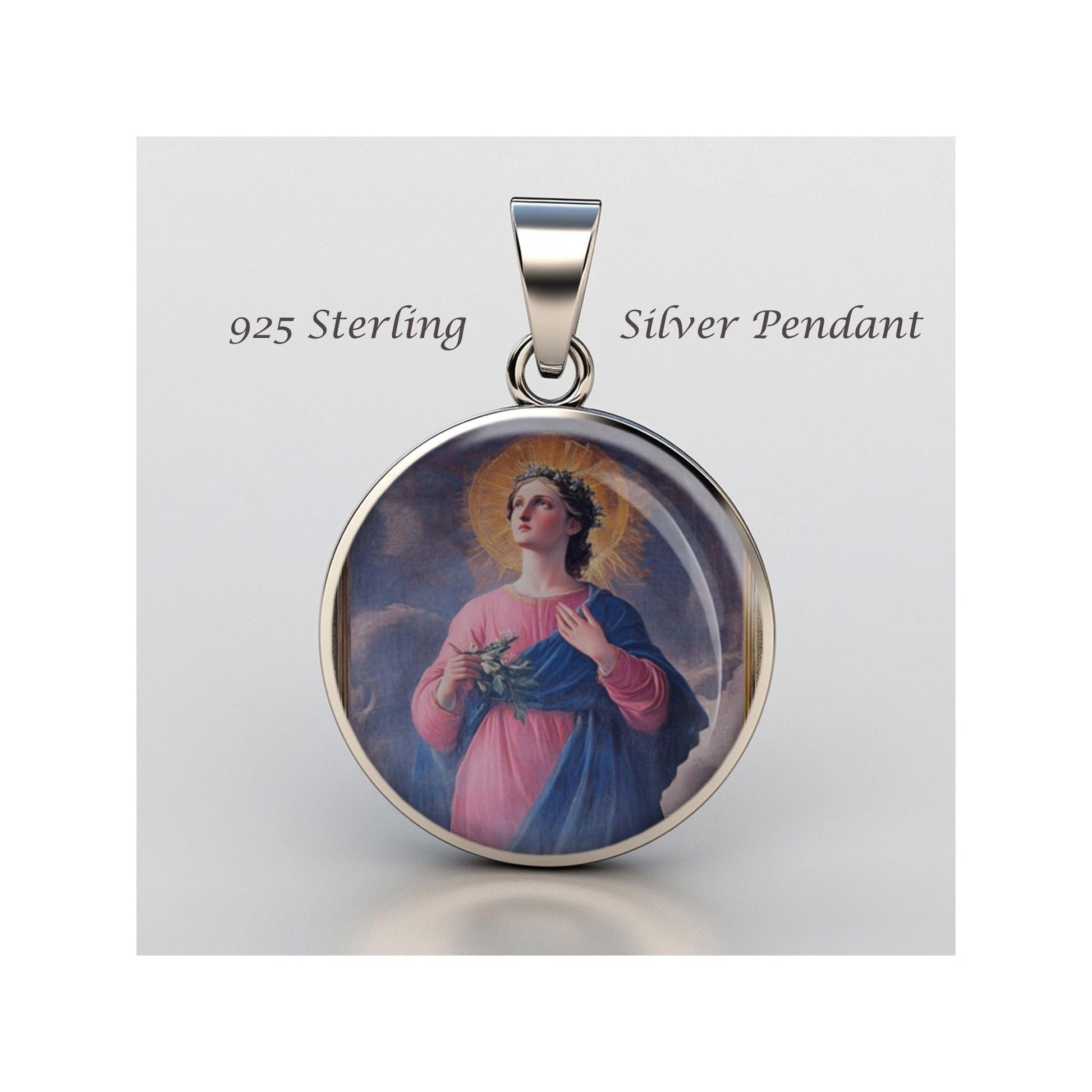 Dedicated to Saint Perpetua, this 20mm sterling silver pendant features a delicate design under a clear glass dome, crafted with high-quality paper. The pendant comes in a beautiful jewelry box, ready for gifting—perfect for birthdays, anniversaries, Christmas, Easter, Baptism, First Communion, Confirmation, Mother's Day, or as a thoughtful gift for a loved one.