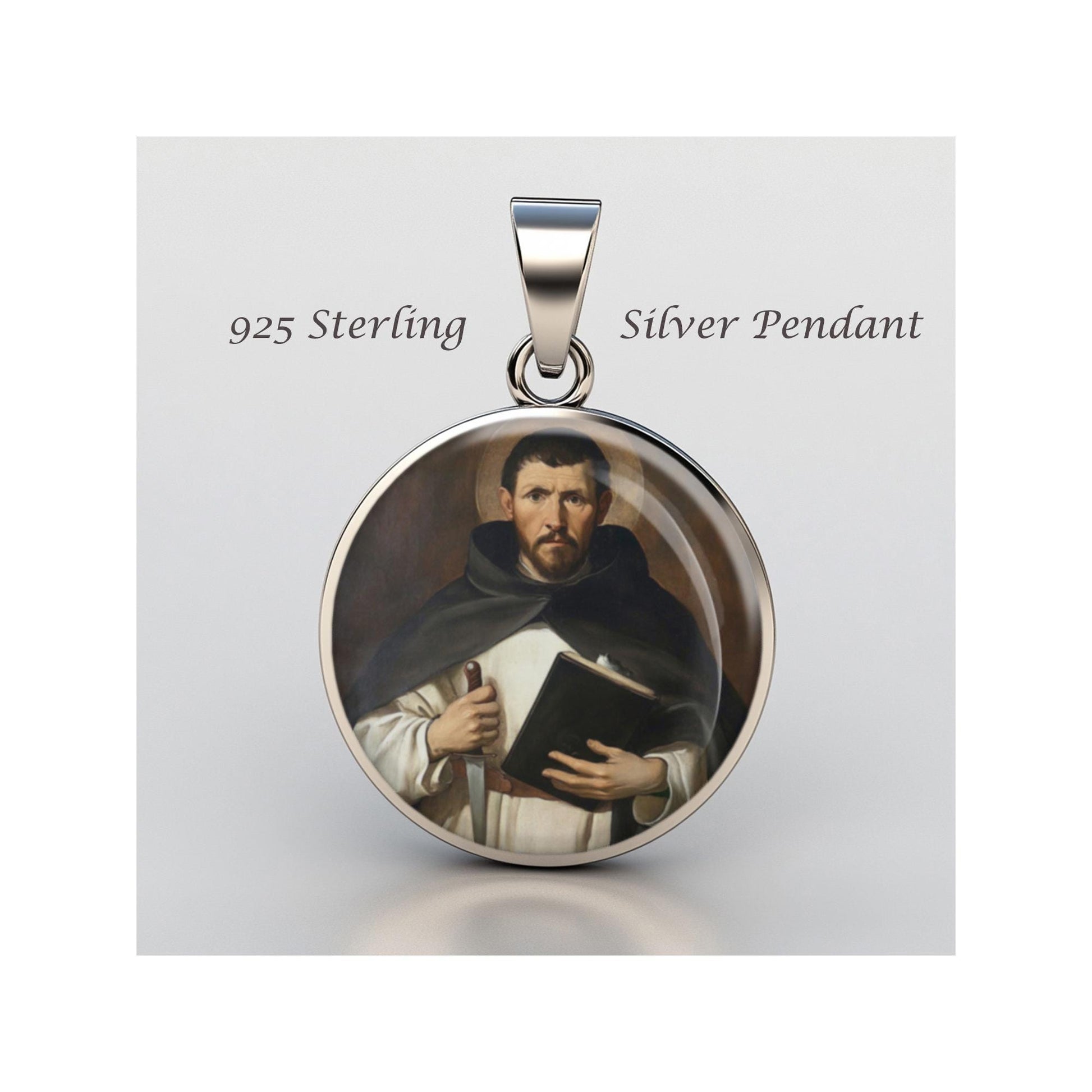 Dedicated to Saint Peter Of Verona, this 20mm sterling silver pendant features a delicate design under a clear glass dome, crafted with high-quality paper. The pendant comes in a beautiful jewelry box, ready for gifting—perfect for birthdays, anniversaries, Christmas, Easter, Baptism, First Communion, Confirmation, Mother's Day, or as a thoughtful gift for a loved one.