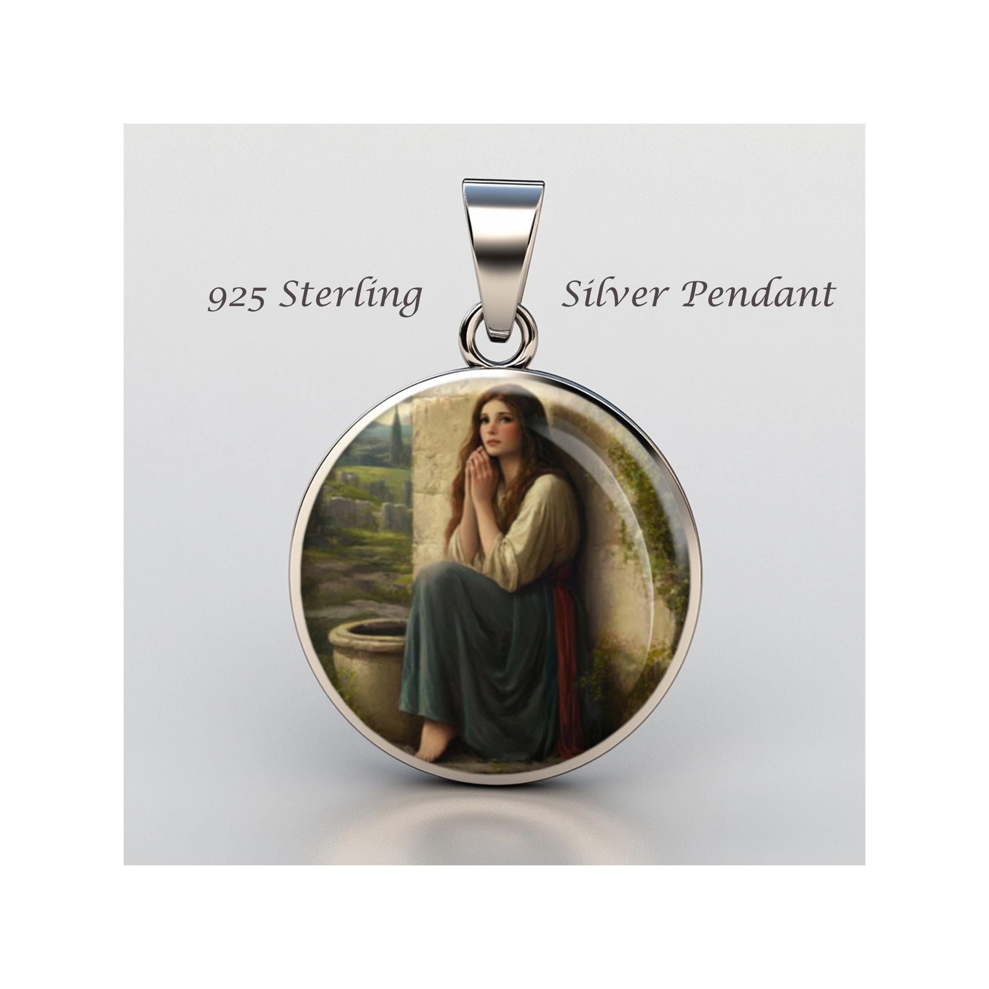 Dedicated to Saint Photini The Samaritan Woman, this 20mm sterling silver pendant features a delicate design under a clear glass dome, crafted with high-quality paper. The pendant comes in a beautiful jewelry box, ready for gifting—perfect for birthdays, anniversaries, Christmas, Easter, Baptism, First Communion, Confirmation, Mother's Day, or as a thoughtful gift for a loved one.