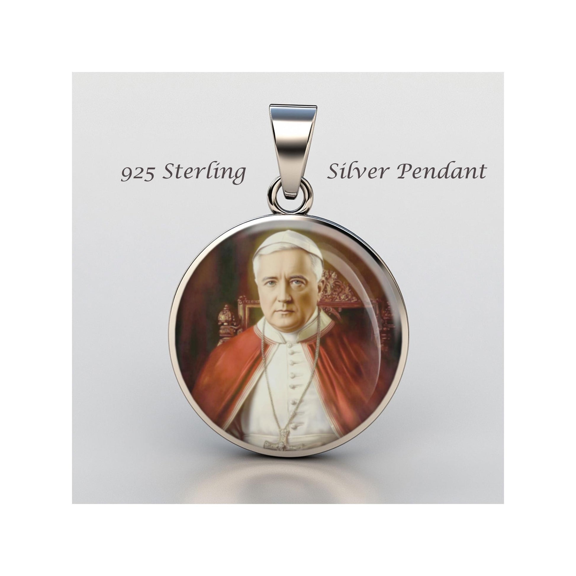 Dedicated to Saint Pope Pius X, this 20mm sterling silver pendant features a delicate design under a clear glass dome, crafted with high-quality paper. The pendant comes in a beautiful jewelry box, ready for gifting—perfect for birthdays, anniversaries, Christmas, Easter, Baptism, First Communion, Confirmation, Mother's Day, or as a thoughtful gift for a loved one.