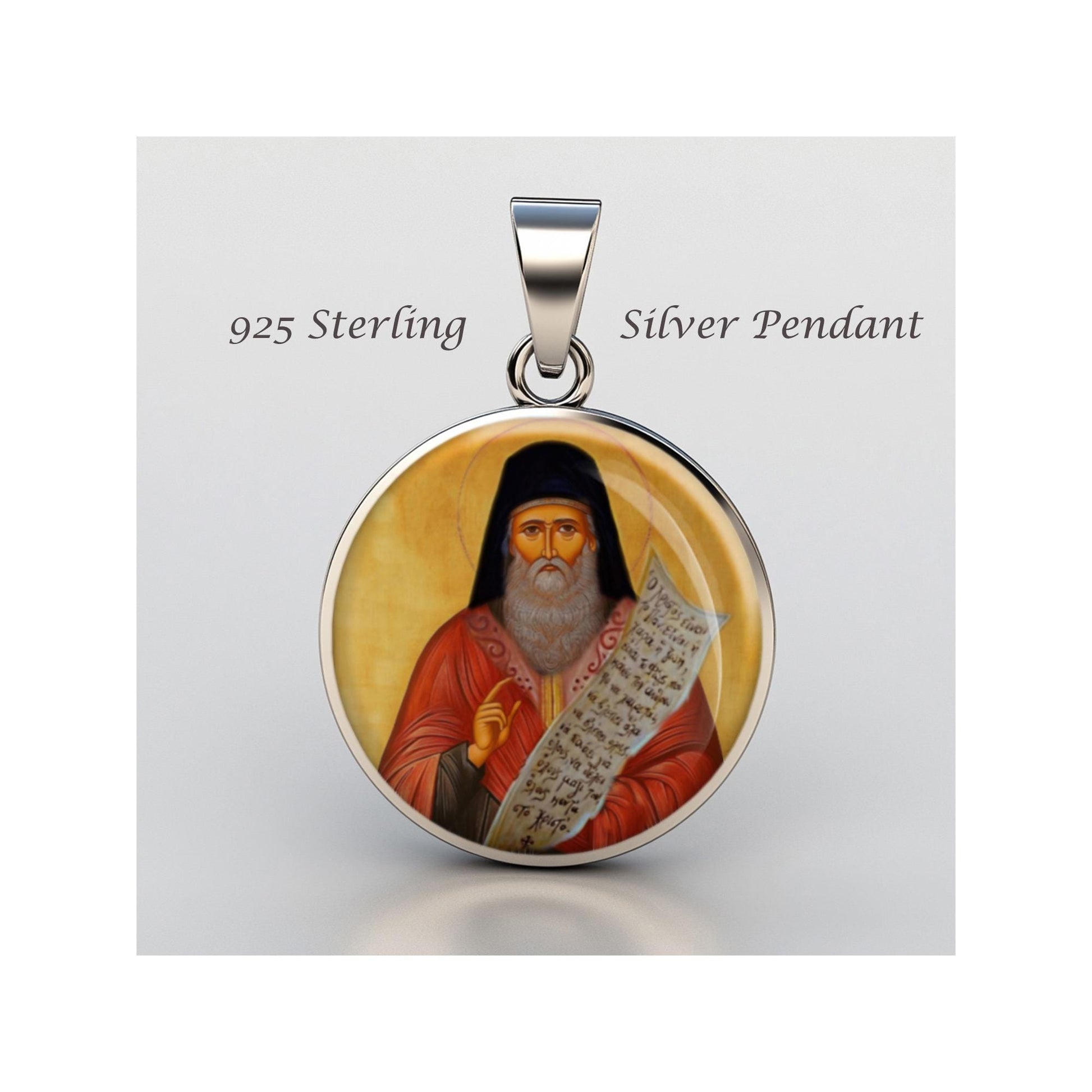Dedicated to Saint Porphyrios, this 20mm sterling silver pendant features a delicate design under a clear glass dome, crafted with high-quality paper. The pendant comes in a beautiful jewelry box, ready for gifting—perfect for birthdays, anniversaries, Christmas, Easter, Baptism, First Communion, Confirmation, Mother's Day, or as a thoughtful gift for a loved one.