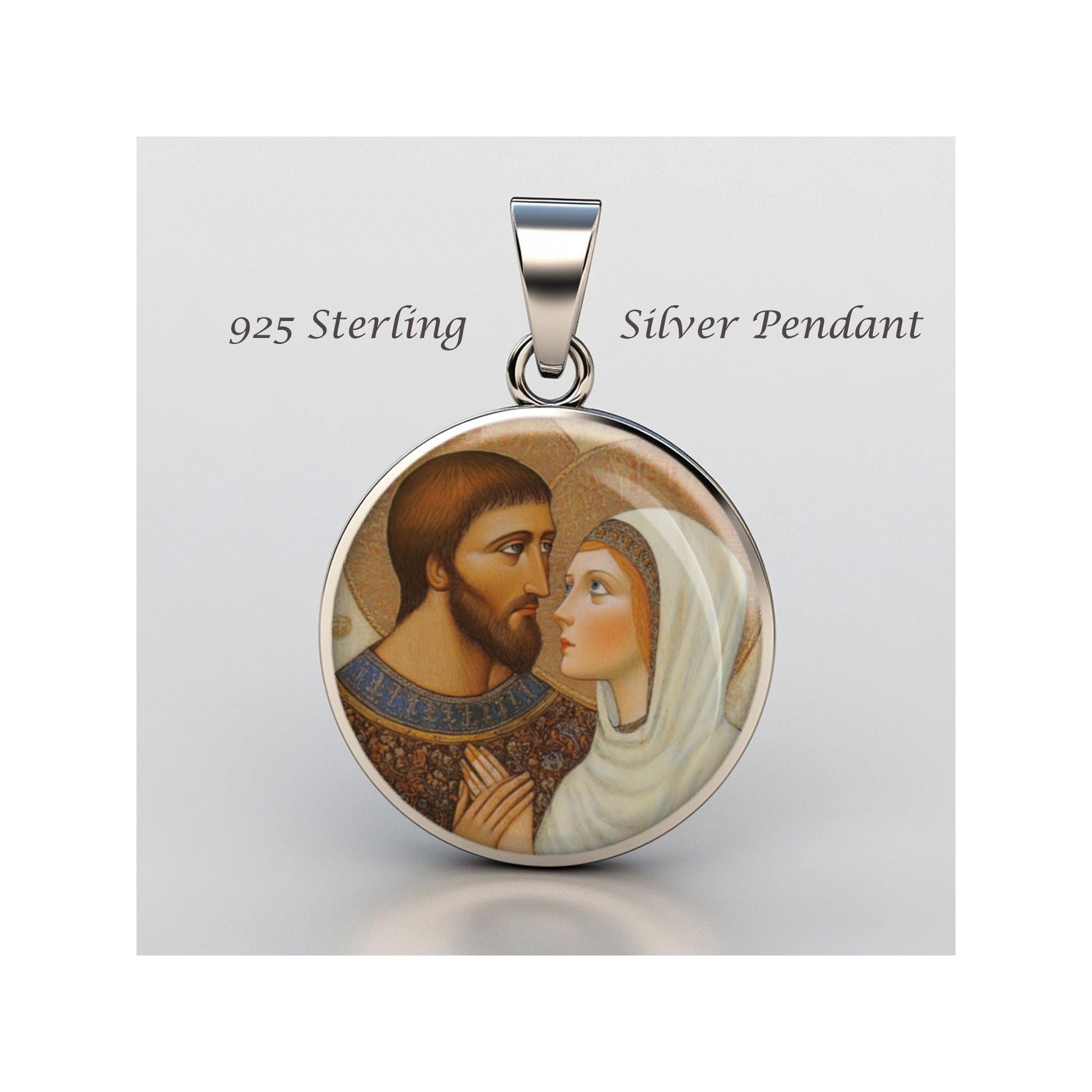Dedicated to Saint Priscilla And St Aquila, this 20mm sterling silver pendant features a delicate design under a clear glass dome, crafted with high-quality paper. The pendant comes in a beautiful jewelry box, ready for gifting—perfect for birthdays, anniversaries, Christmas, Easter, Baptism, First Communion, Confirmation, Mother's Day, or as a thoughtful gift for a loved one.