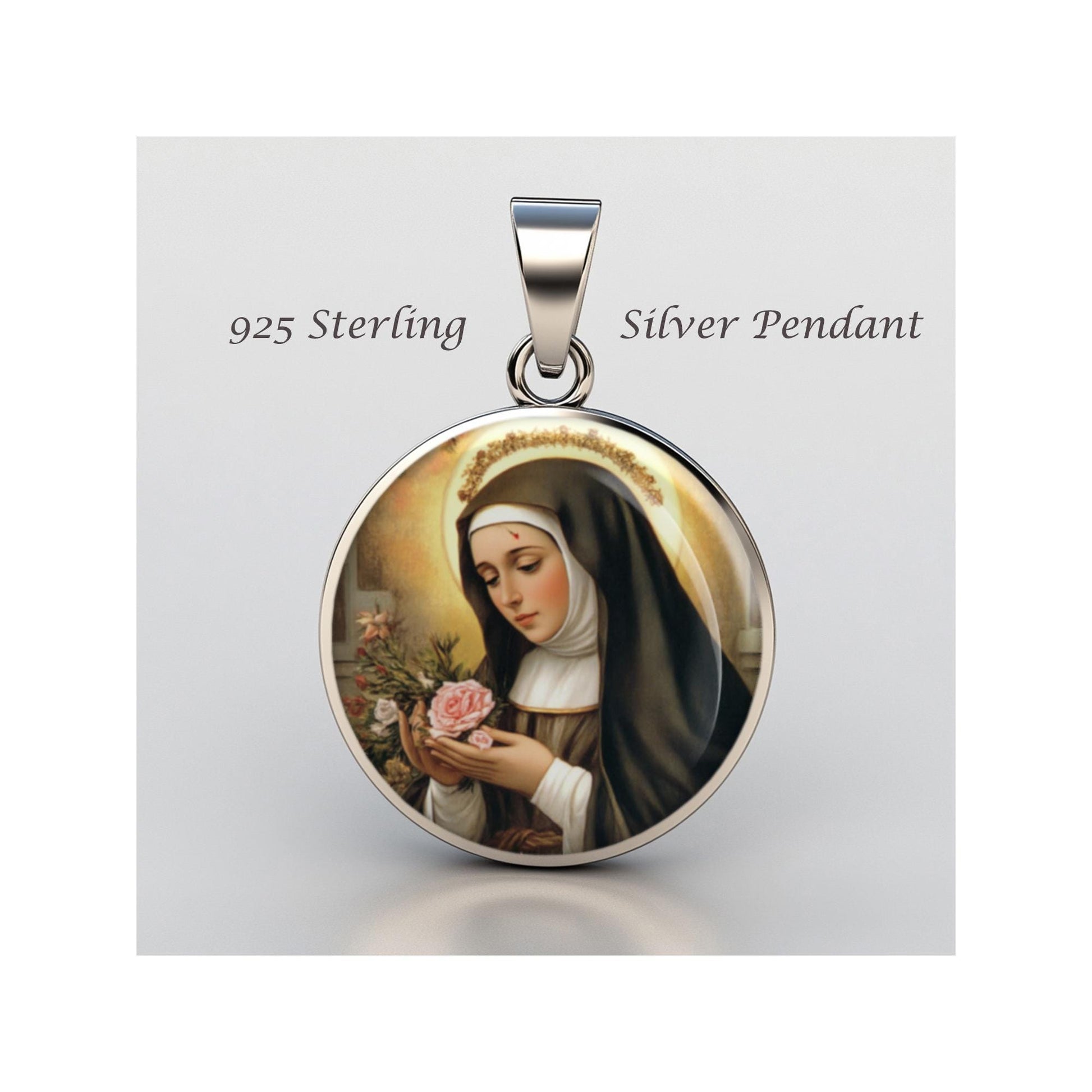 Dedicated to Saint Rita Of Cascia, this 20mm sterling silver pendant features a delicate design under a clear glass dome, crafted with high-quality paper. The pendant comes in a beautiful jewelry box, ready for gifting—perfect for birthdays, anniversaries, Christmas, Easter, Baptism, First Communion, Confirmation, Mother's Day, or as a thoughtful gift for a loved one.