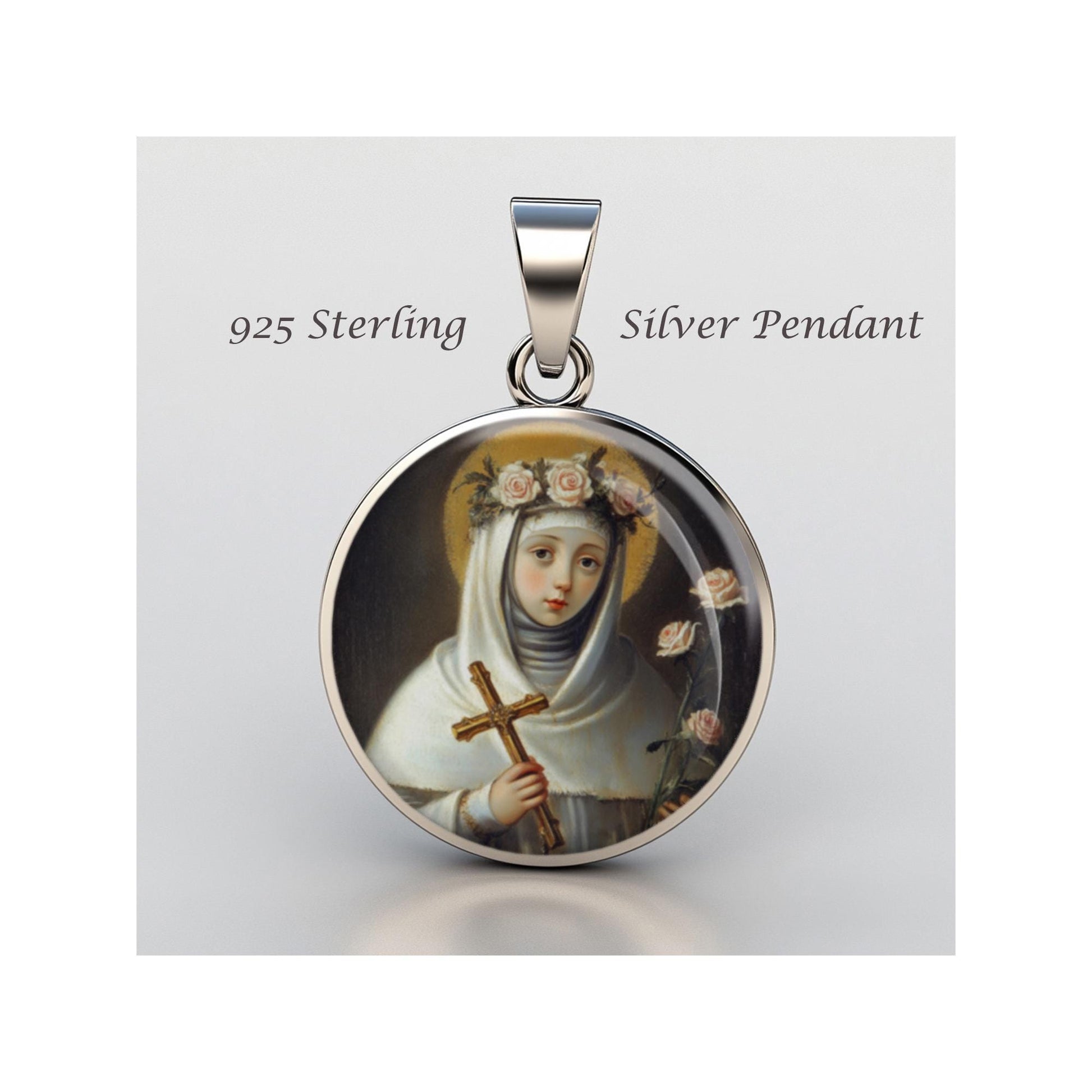 Dedicated to Saint Rose Lima, this 20mm sterling silver pendant features a delicate design under a clear glass dome, crafted with high-quality paper. The pendant comes in a beautiful jewelry box, ready for gifting—perfect for birthdays, anniversaries, Christmas, Easter, Baptism, First Communion, Confirmation, Mother's Day, or as a thoughtful gift for a loved one.