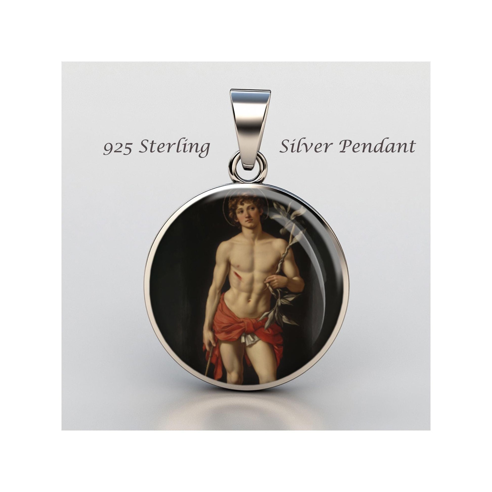 Dedicated to Saint Sebastian, this 20mm sterling silver pendant features a delicate design under a clear glass dome, crafted with high-quality paper. The pendant comes in a beautiful jewelry box, ready for gifting—perfect for birthdays, anniversaries, Christmas, Easter, Baptism, First Communion, Confirmation, Mother's Day, or as a thoughtful gift for a loved one.