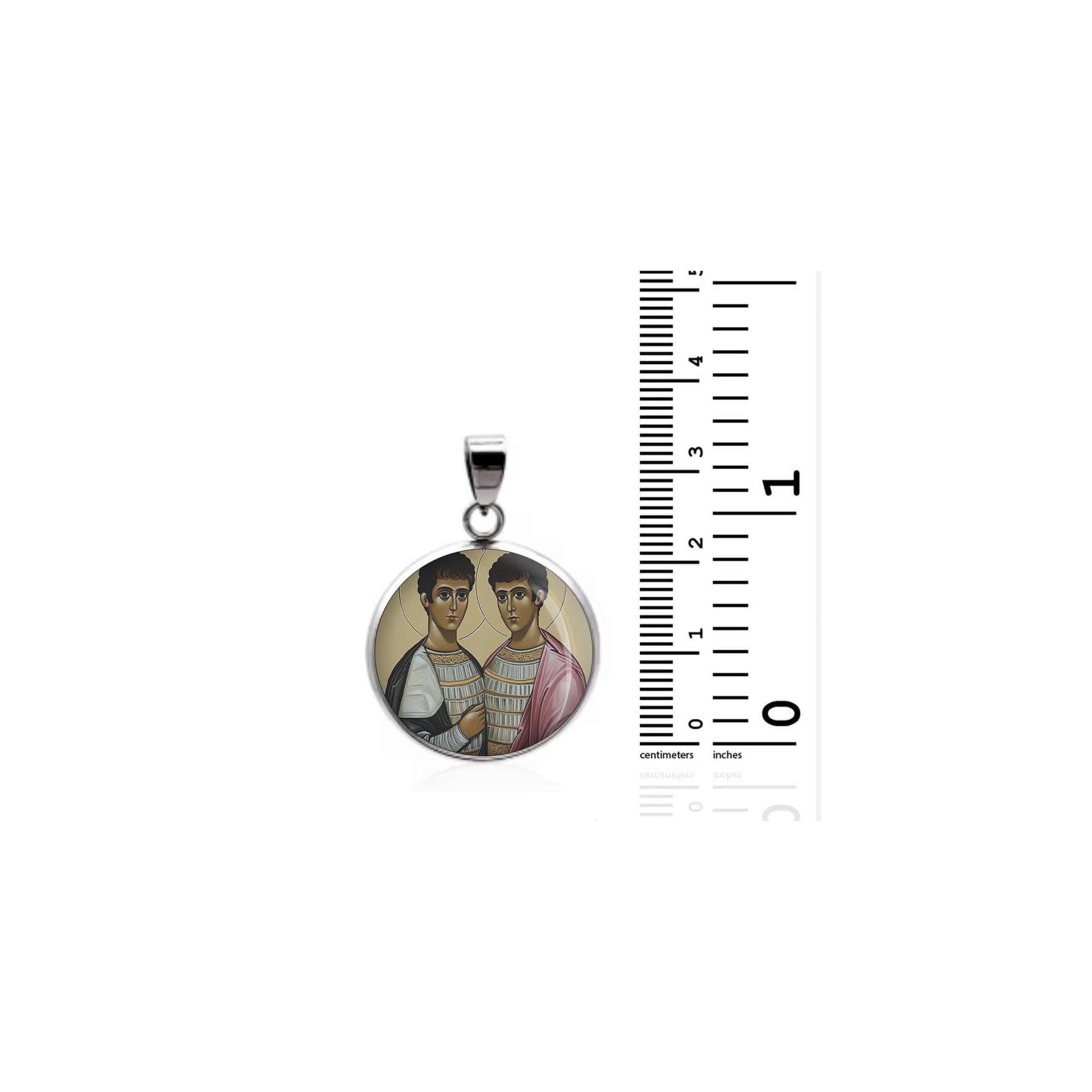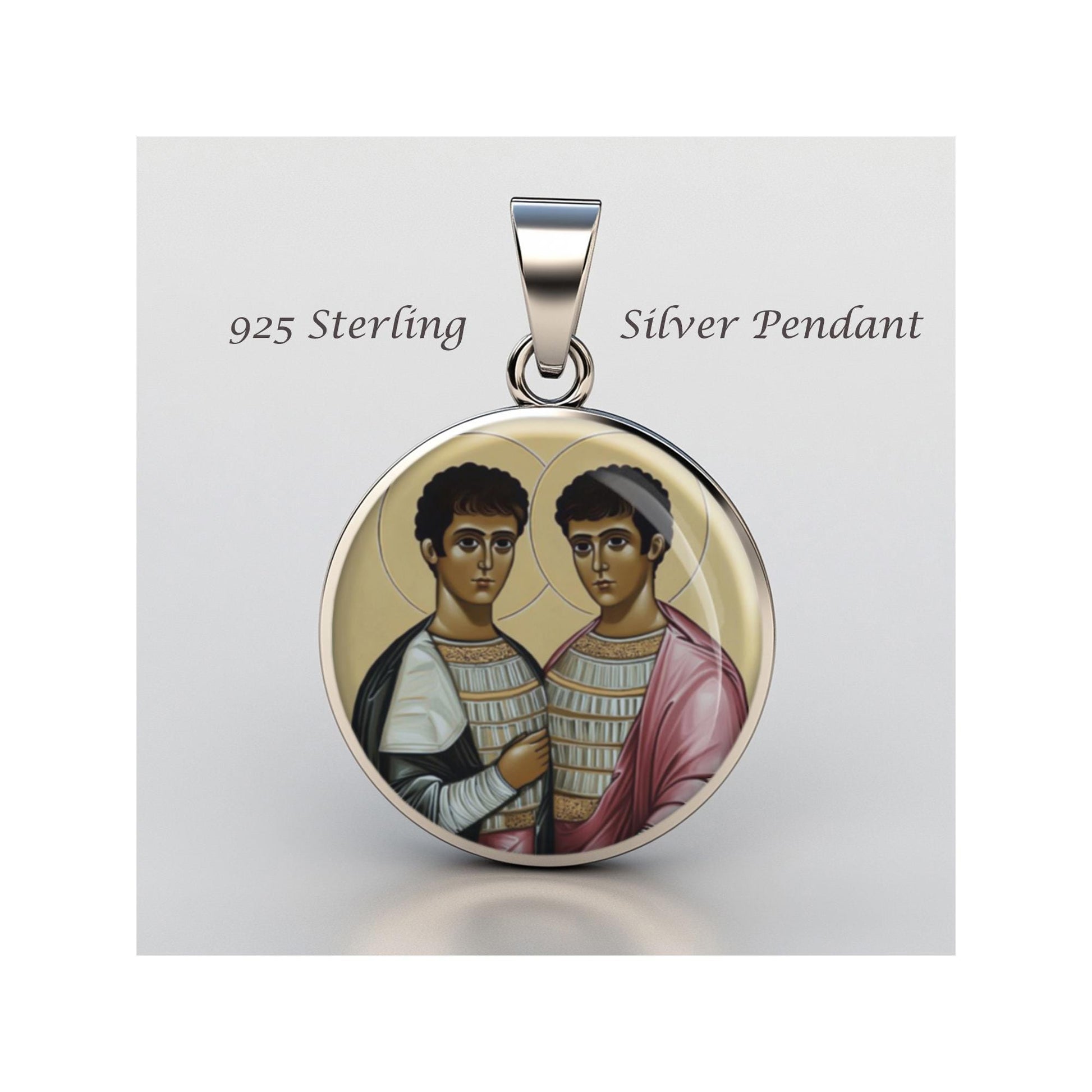Dedicated to Saint Sergius And Bachus, this 20mm sterling silver pendant features a delicate design under a clear glass dome, crafted with high-quality paper. The pendant comes in a beautiful jewelry box, ready for gifting—perfect for birthdays, anniversaries, Christmas, Easter, Baptism, First Communion, Confirmation, Mother's Day, or as a thoughtful gift for a loved one.