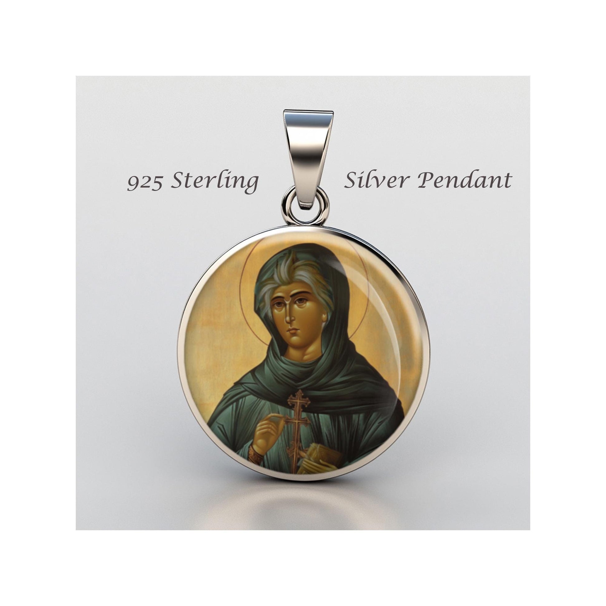 Dedicated to Saint Sofia, this 20mm sterling silver pendant features a delicate design under a clear glass dome, crafted with high-quality paper. The pendant comes in a beautiful jewelry box, ready for gifting—perfect for birthdays, anniversaries, Christmas, Easter, Baptism, First Communion, Confirmation, Mother's Day, or as a thoughtful gift for a loved one.